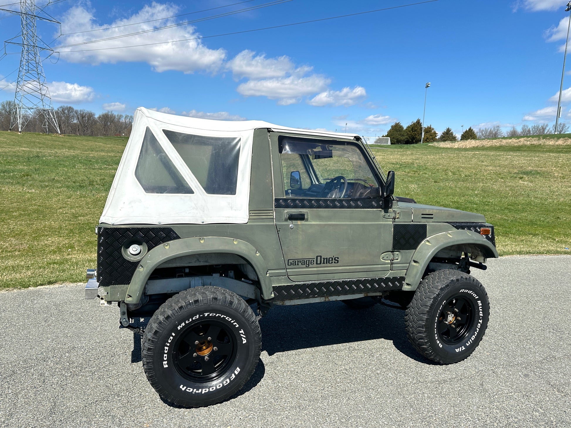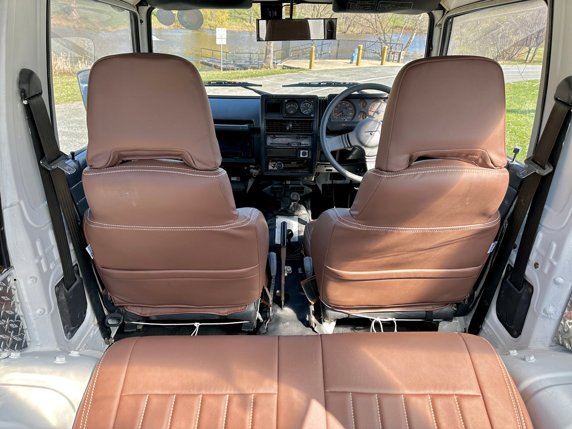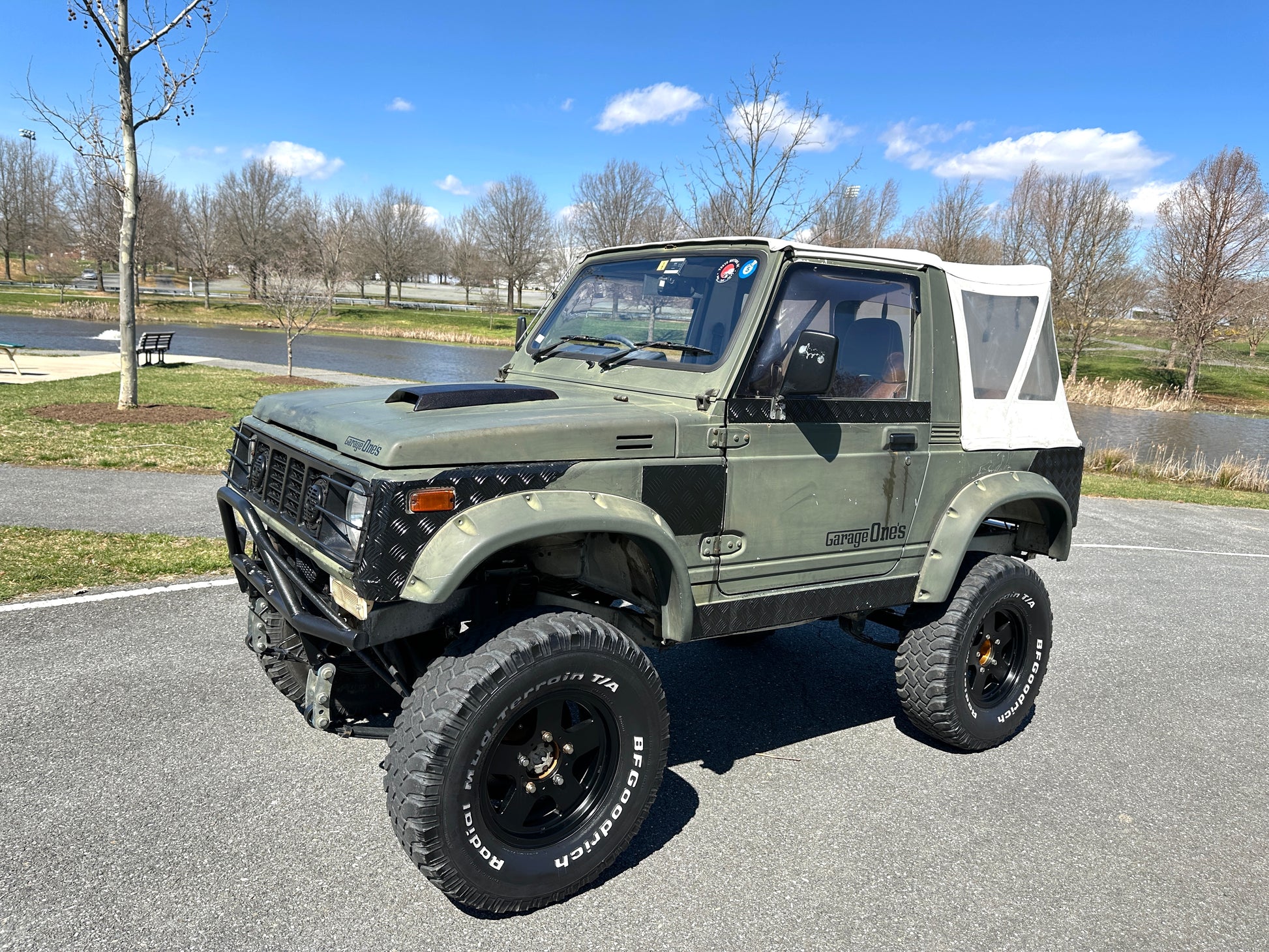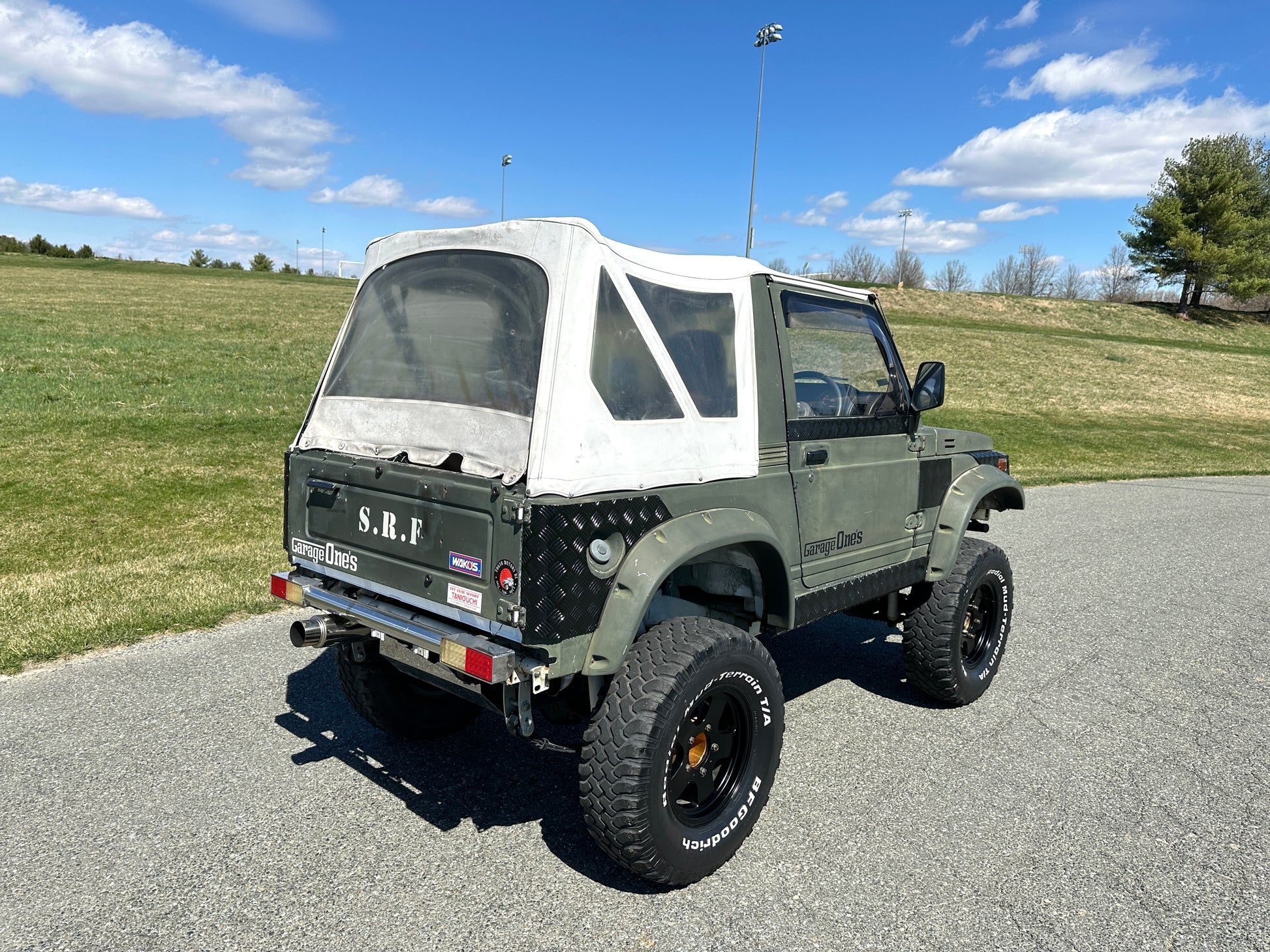 1989 SUZUKI JIMNY TURBO 4WD M-JA71C —— 60,817 Miles, “F5A”, Inline 3, 543cc, Gasoline, Turbocharged, 5-Speed Manual Transmission, Selectable 4WD With A 2-Speed Transfercase, Manually-Locking Front Hubs, Solid Front Axle, 15” Inch Wheels, 4 Seater, Leather Seat Covers With Front Bucket Seats, Folding Rear Seats, After Market Front & Rear Bumpers, Wide Fender Flares, Lifted, Aftermarket Exhaust, Soft Top, Air Conditioner & Heat.