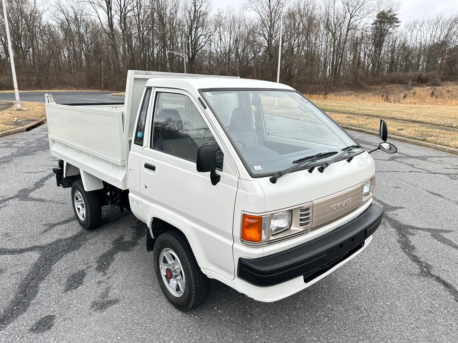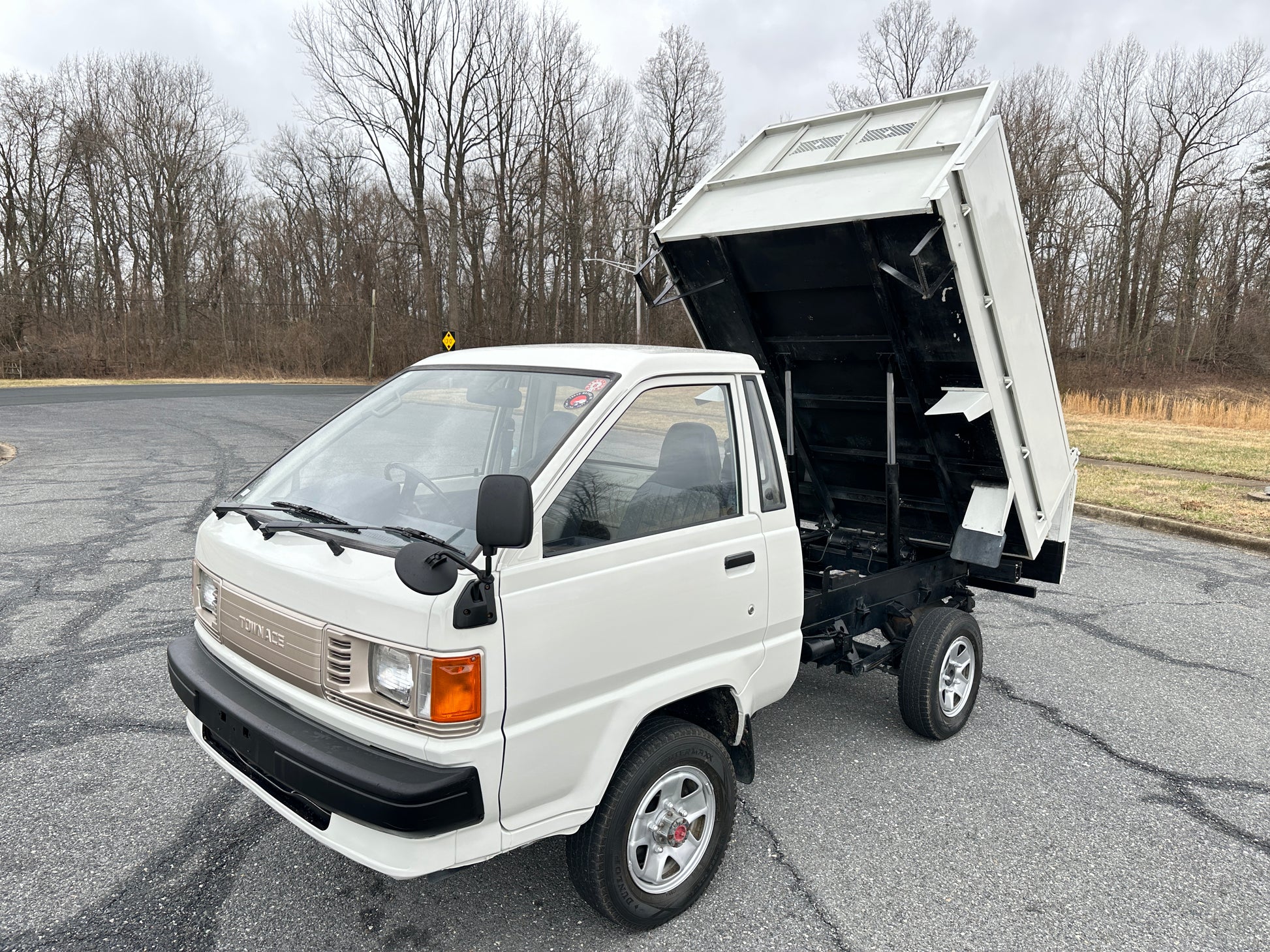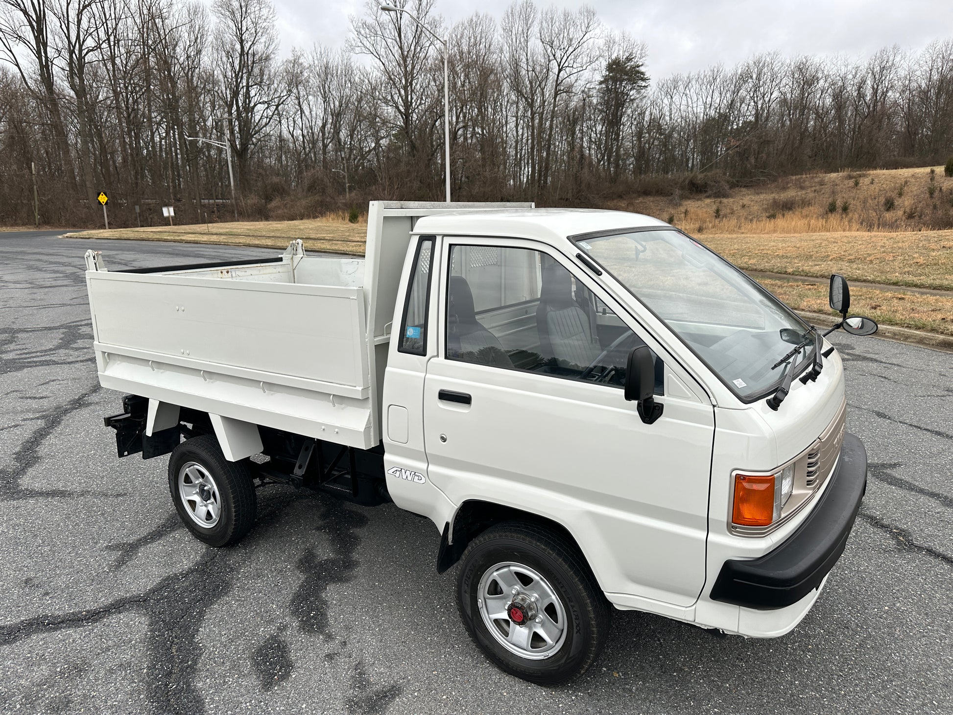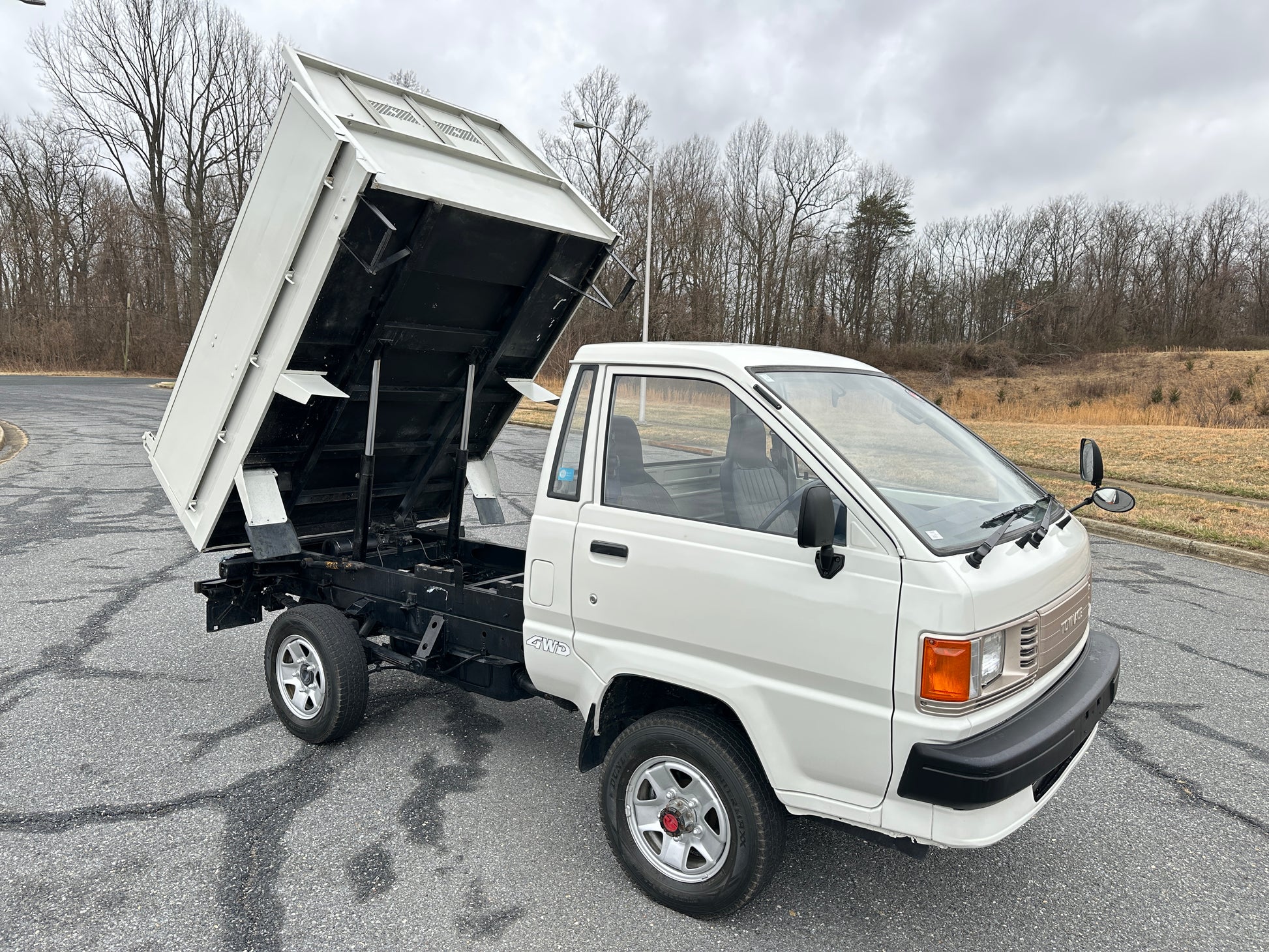 1989 TOYOTA TOWNACE YM60——31,003 MILES. “2Y” 1812cc, Inline Four, Gasoline, Column-Shifted 4 Speed Manual Transmission, Floor Shifted 2 Speed Transfer Case, Push Button 4WD, White Paint (048), Blue Vinyl Upholstery, 60/40 Split Seat With A Center Armrest, Manual Windows, TECS HIGH-SIDE DUMP BED with a 750KG Payload Capacity, New Battery, Recently Rebuilt Hydraulic Dump Cylinders.