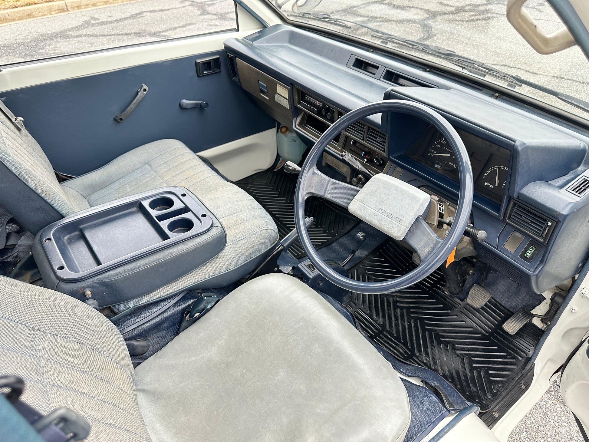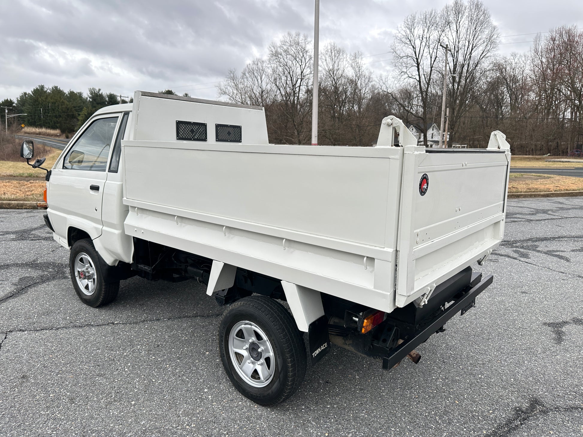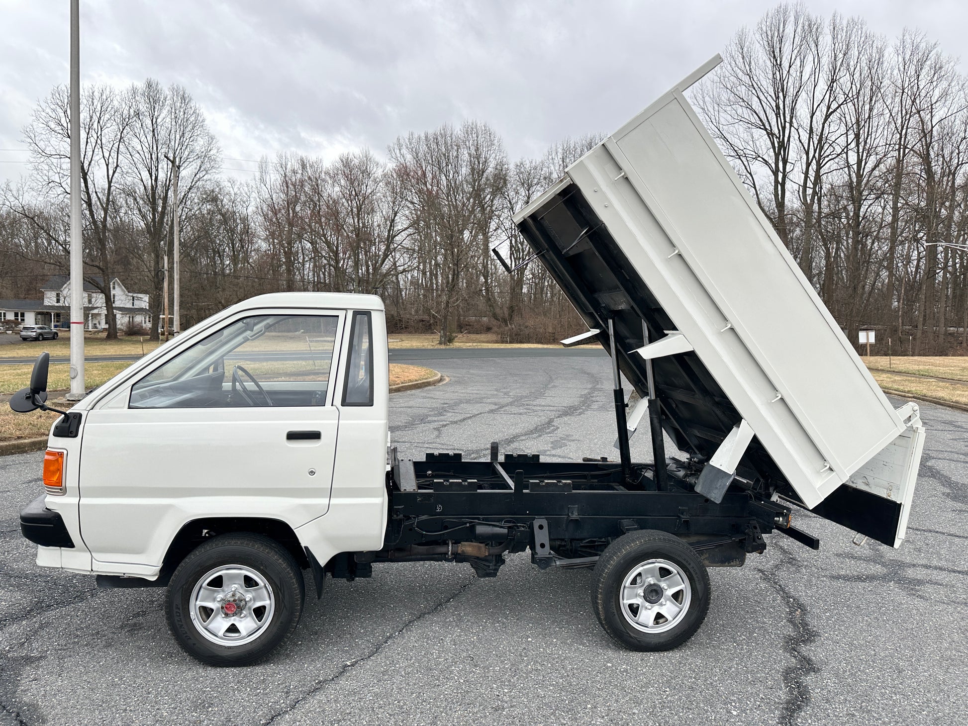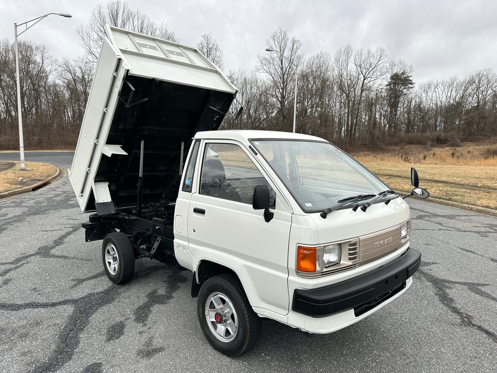 1989 TOYOTA TOWNACE YM60——31,003 MILES. “2Y” 1812cc, Inline Four, Gasoline, Column-Shifted 4 Speed Manual Transmission, Floor Shifted 2 Speed Transfer Case, Push Button 4WD, White Paint (048), Blue Vinyl Upholstery, 60/40 Split Seat With A Center Armrest, Manual Windows, TECS HIGH-SIDE DUMP BED with a 750KG Payload Capacity, New Battery, Recently Rebuilt Hydraulic Dump Cylinders.