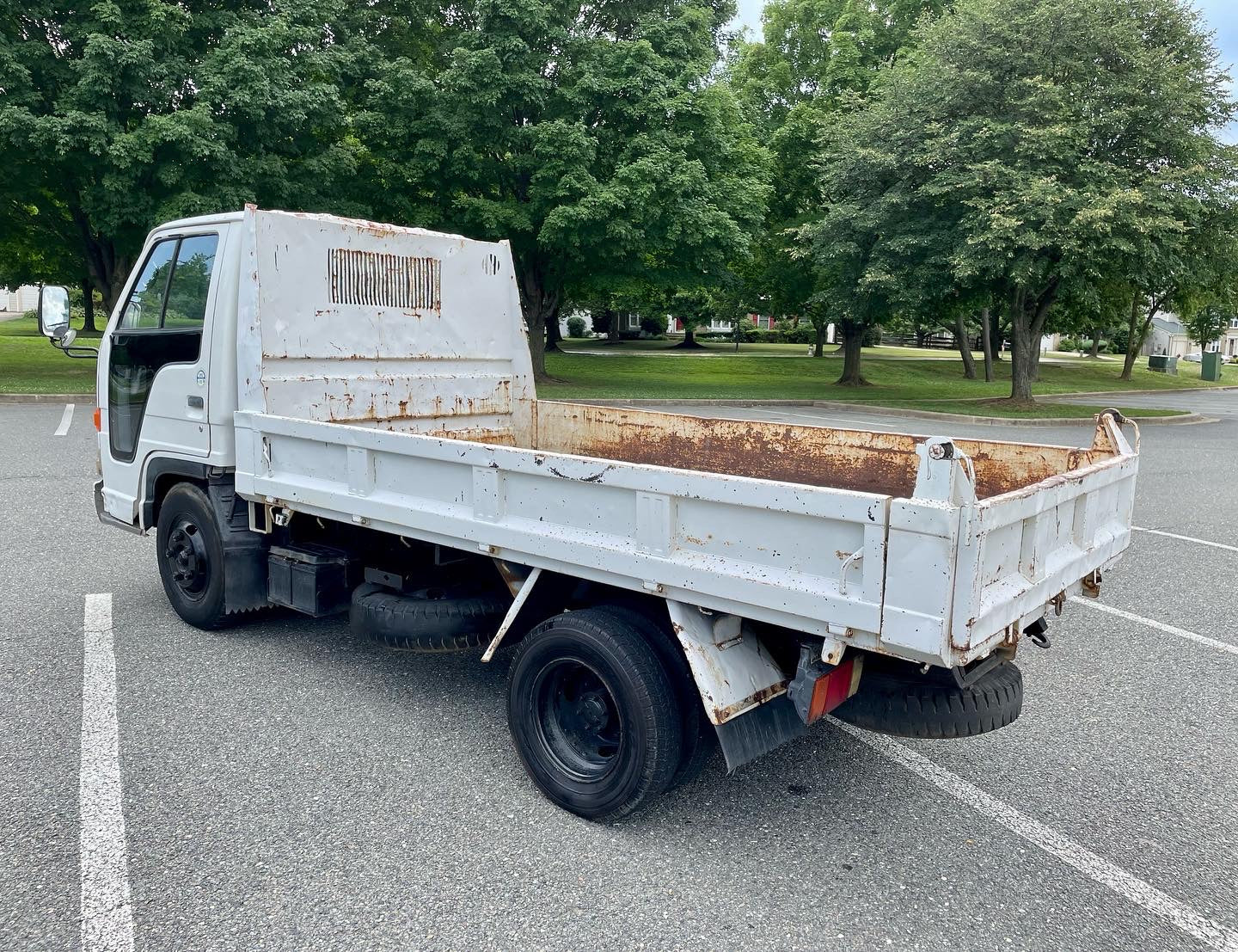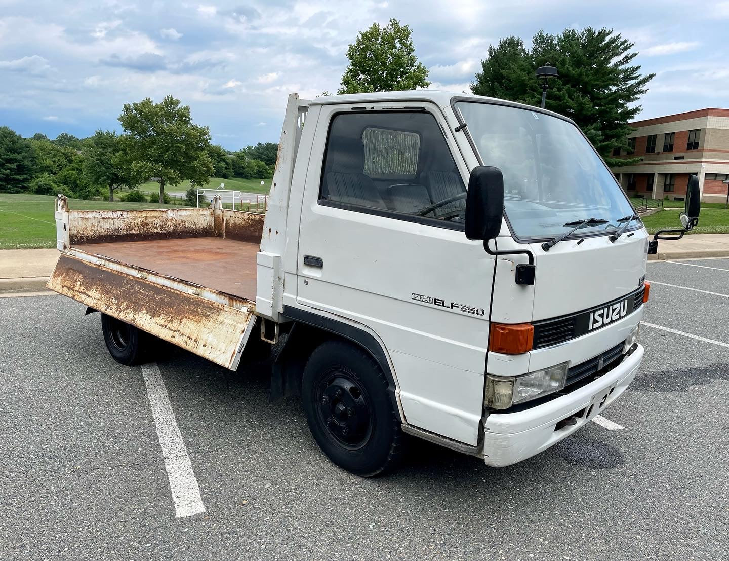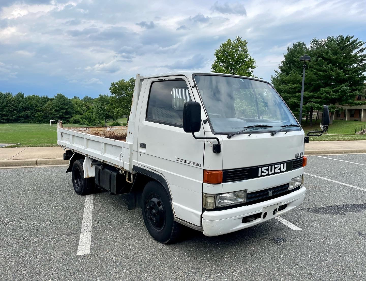 1991 ISUZU ELF 250 DUMP TRUCK NKR58E——50K miles. 2 TON LOAD CAPACITY! “RLH” 3630cc, Inline Four, Diesel Engine, 5 Speed Manual Transmission, Engine Brake, Cold A/C, White Paint (820), Vinyl Upholstery, 60/40 Split Seat With A Center Armrest, Manual Windows, Drop-Side Cargo Bed, Bulkhead Bar, Will Come With A Maryland Title and Import Documents