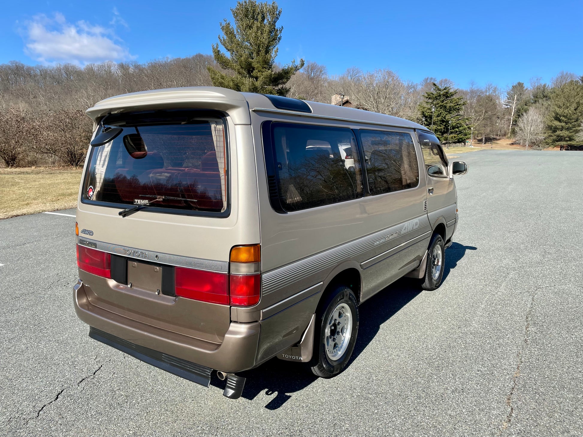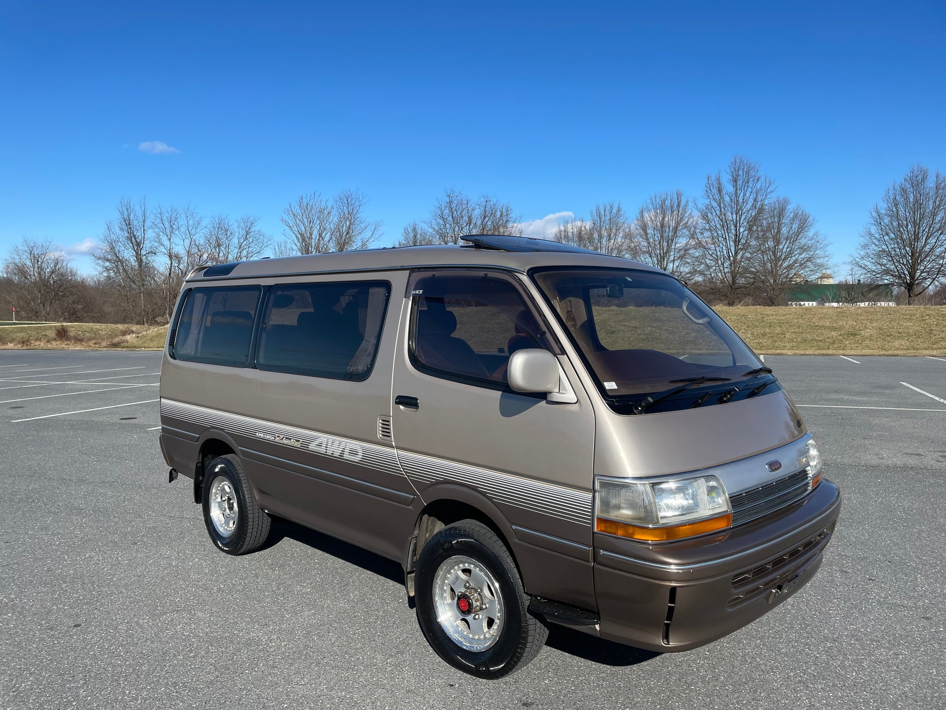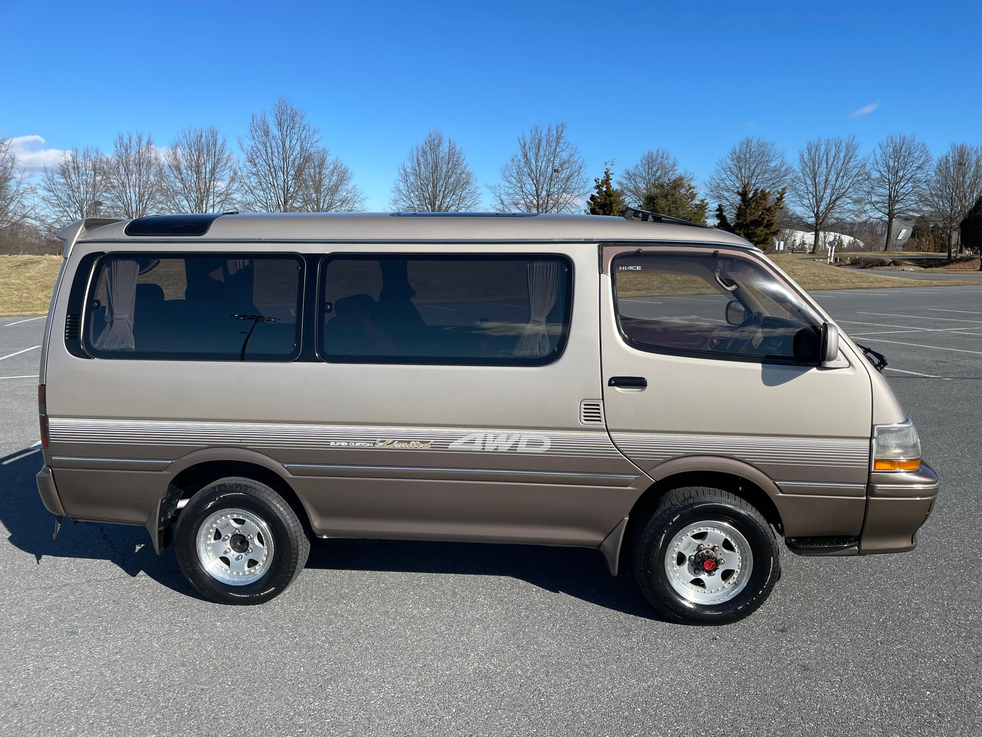 1991 TOYOTA HIACE SUPER CUSTOM LIMITED LH107 ——141K miles, “3L” 2.8 Liter Inline 4, Diesel, Four-Speed Automatic Transmission, SELECTABLE 4WD, DUAL-RANGE TRANSFER CASE, Venting Front Sunroof, Massive Central Sunroof, Power Rear Sunroof, Two-Tone Paint, Red Cloth Upholstery, Factory 3rd Row, 180 Degree Swivel Middle Row, Full Flat Folding Seats, Dual Zone Climate Control, Power Windows, Power Mirrors, All Weather Floor Mats, Power Locks, Soft Closing Sliding Door, Power Curtains, CV645 Wheels Wrapped In Brand New Tires, RARE COFFEE POT, COOLER AND HOT BOX WITH ICE MAKER, DIGITAL CLUSTER, AISIN MANUAL LOCKING FRONT HUBS.