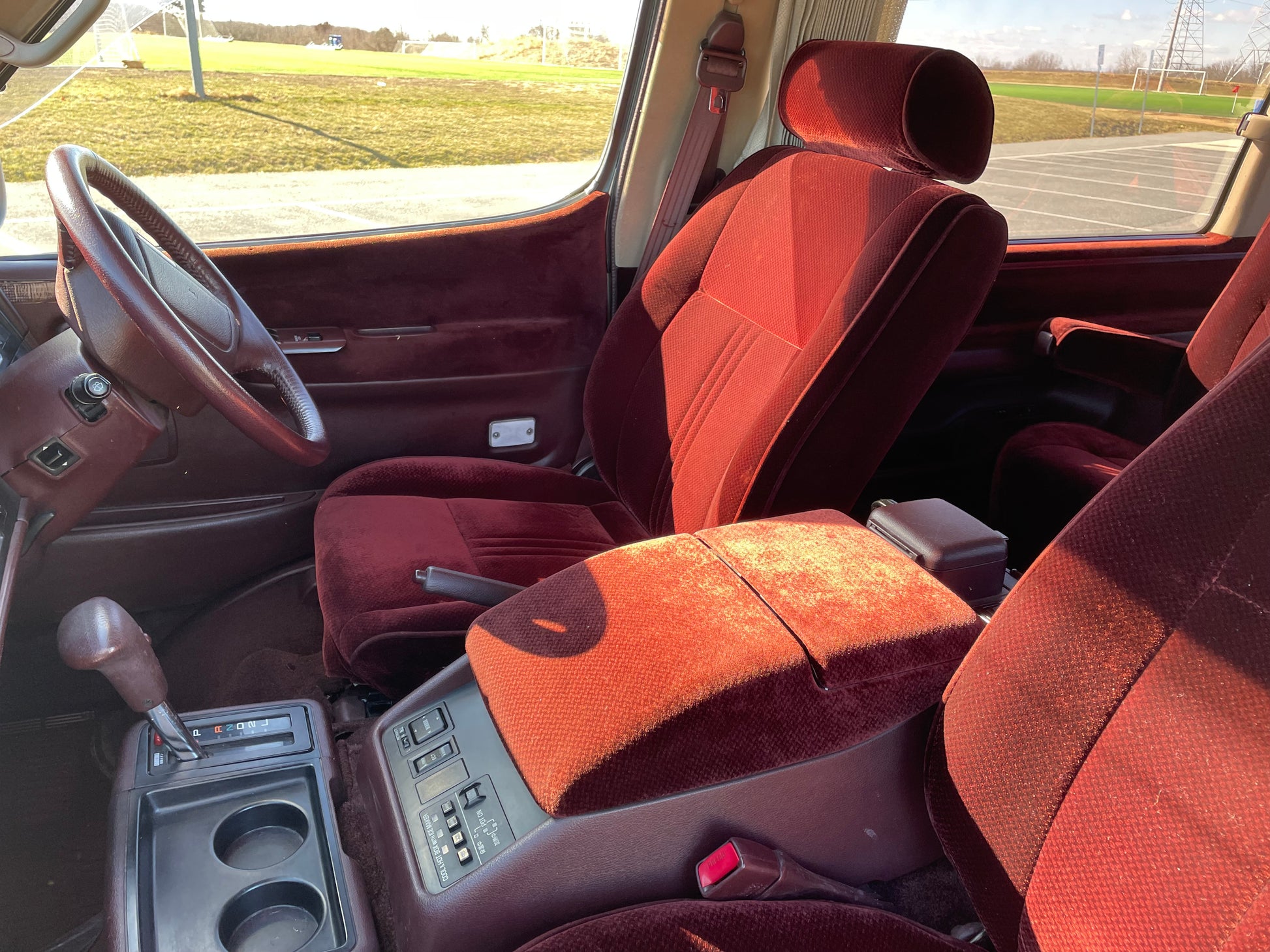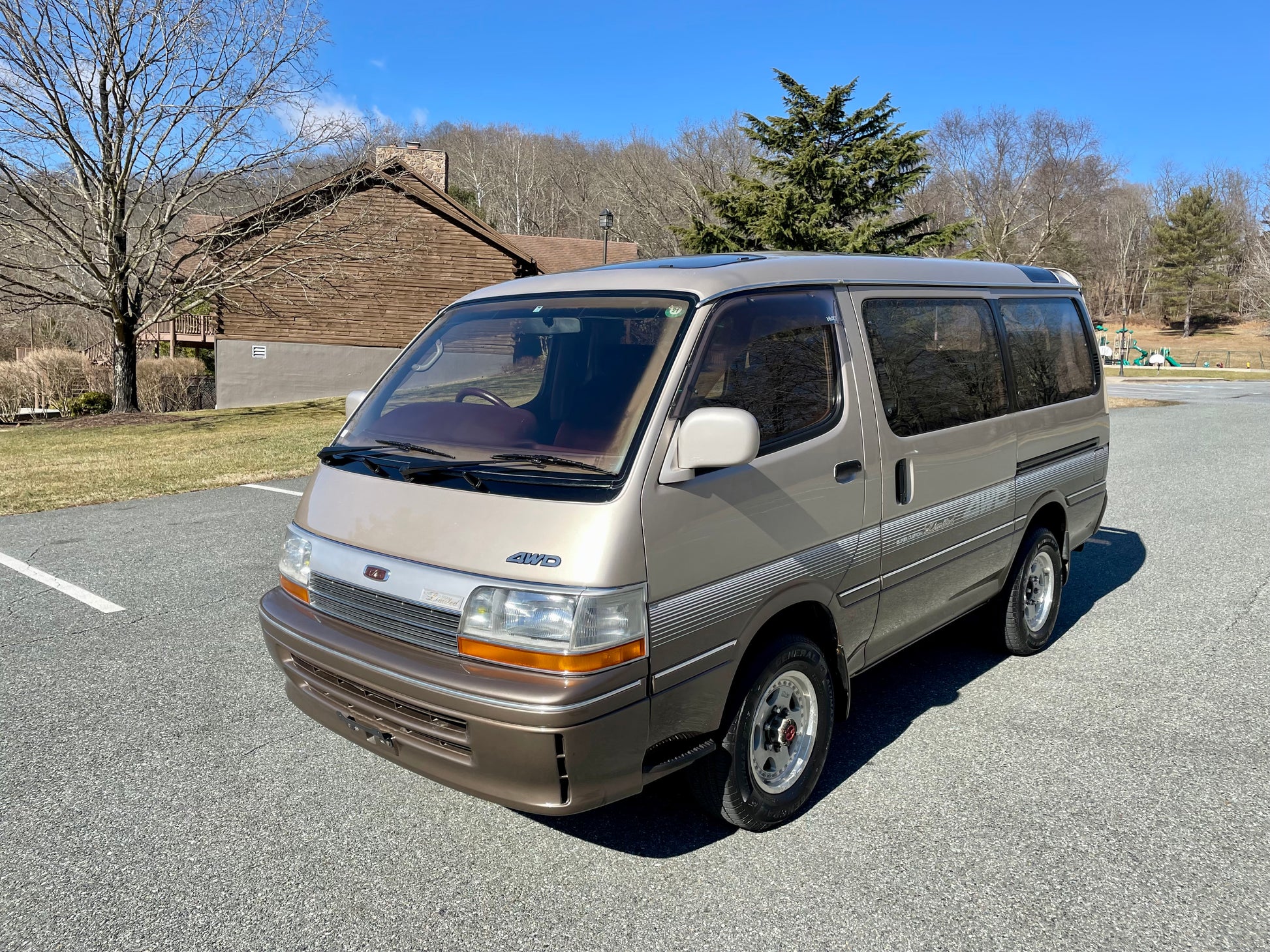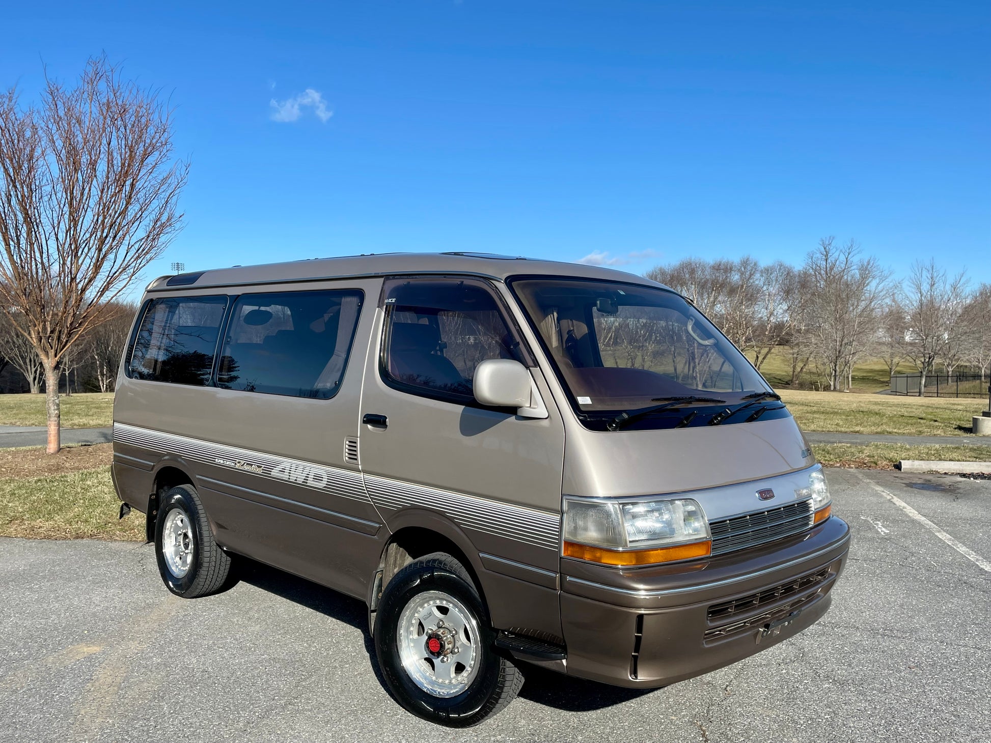 1991 TOYOTA HIACE SUPER CUSTOM LIMITED LH107 ——141K miles, “3L” 2.8 Liter Inline 4, Diesel, Four-Speed Automatic Transmission, SELECTABLE 4WD, DUAL-RANGE TRANSFER CASE, Venting Front Sunroof, Massive Central Sunroof, Power Rear Sunroof, Two-Tone Paint, Red Cloth Upholstery, Factory 3rd Row, 180 Degree Swivel Middle Row, Full Flat Folding Seats, Dual Zone Climate Control, Power Windows, Power Mirrors, All Weather Floor Mats, Power Locks, Soft Closing Sliding Door, Power Curtains, CV645 Wheels Wrapped In Brand New Tires, RARE COFFEE POT, COOLER AND HOT BOX WITH ICE MAKER, DIGITAL CLUSTER, AISIN MANUAL LOCKING FRONT HUBS.