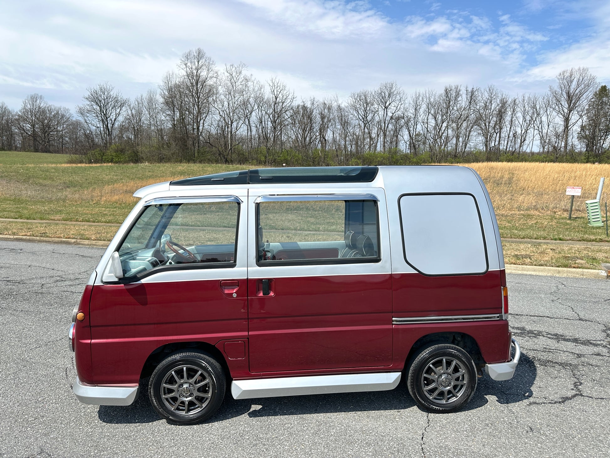1994 SUBARU SAMBAR DIAS V-KV3 —— 86,160 Miles, “EN07” CLOVER 4 ELECTRONIC FUEL INJECTION Engine, 660CC, 4-Cylinder, Gasoline, ECVT Automatic Transmission, RWD, 350kg Load Capacity, Fold-Flat Rear Seats, AIR CONDITIONING & HEAT, Aftermarket Wheels, Sunroof (Non-operational), Red & Silver Two-Tone Paint, Black Faux-Leather Seat Covers.