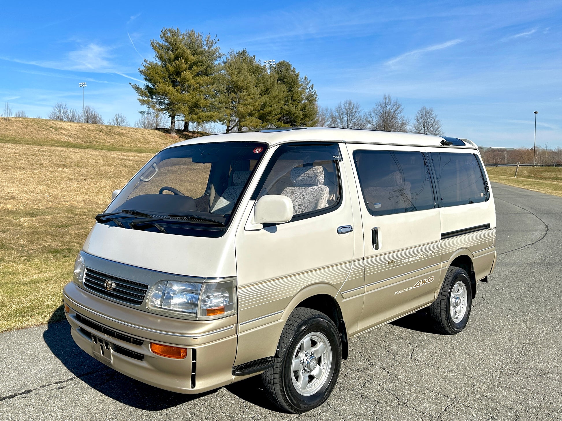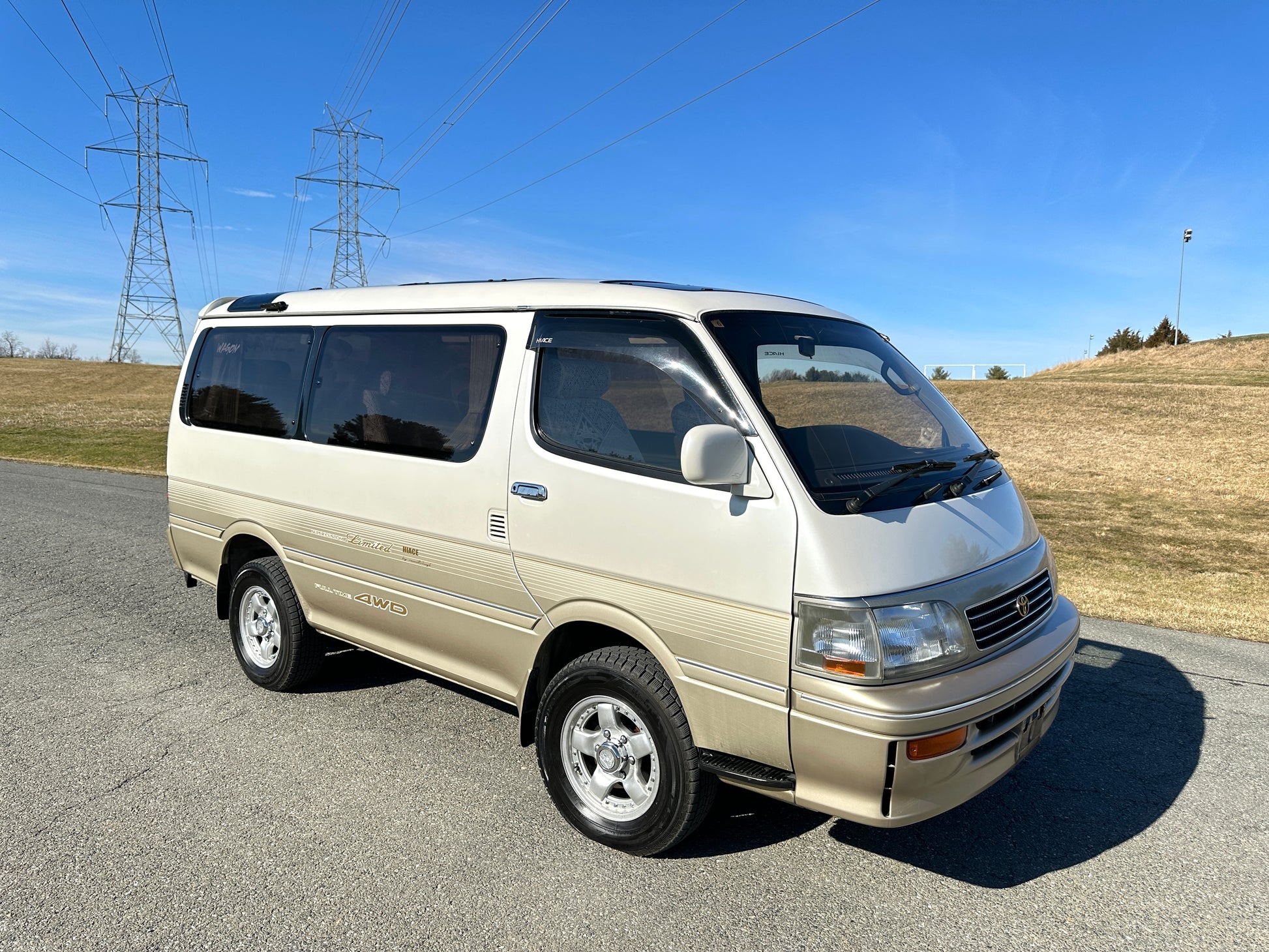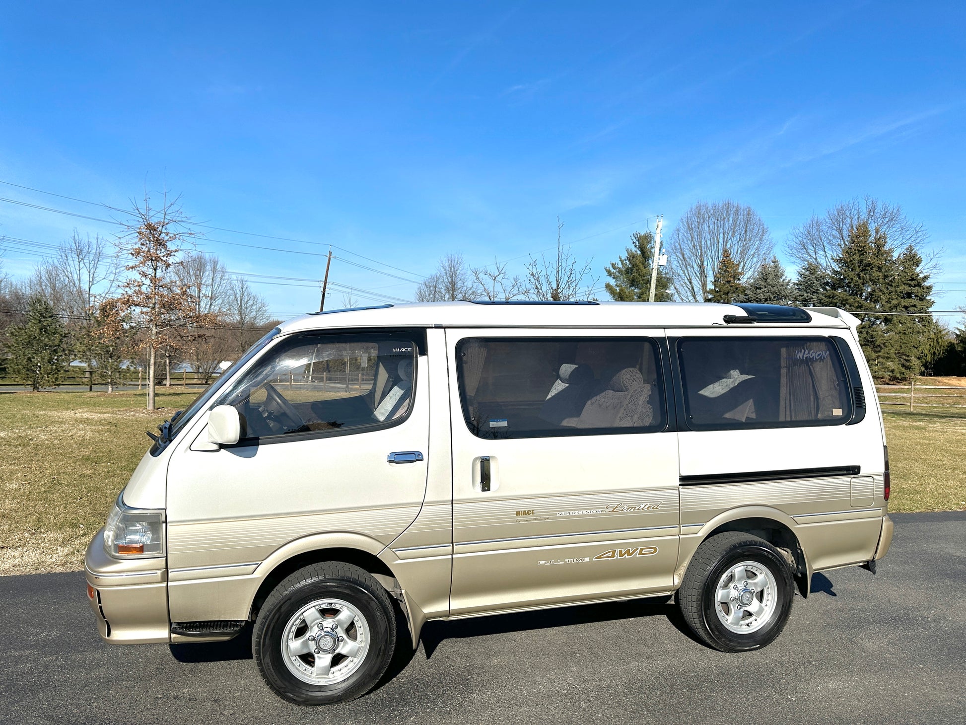 1994 TOYOTA HIACE SUPER CUSTOM LIMITED KZH106 ——105,743 Miles, “1KZ-TE”, 3.0 Liter Inline 4, Turbo Diesel, Automatic Transmission, Full Time 4WD, Venting Front Sunroof, Massive Central Sunroof, Power Rear Sunroof, White Pearl Mica & Light Beige Metallic Two-Tone Paint, Brown Cloth Upholstery With Factor Lace Seat Covers, Factory 3rd Row, 180 Degree Swivel Middle Row, Full Flat Folding Seats, Dual Zone Climate Control, Power Windows, Power Retractable Mirrors, Power Locks, Soft Closing Sliding Door, WEDS ADVENTURE Wheels, DIGITAL INSTRUMENT CLUSTER, HOT/COOLER BOX WITH ICE-MAKER, POWER SLIDING REAR DOOR, TEMS SUSPENSION, IDLE UP SWITCH, JOYFUL TALK, BACK & CLEARANCE SONAR.