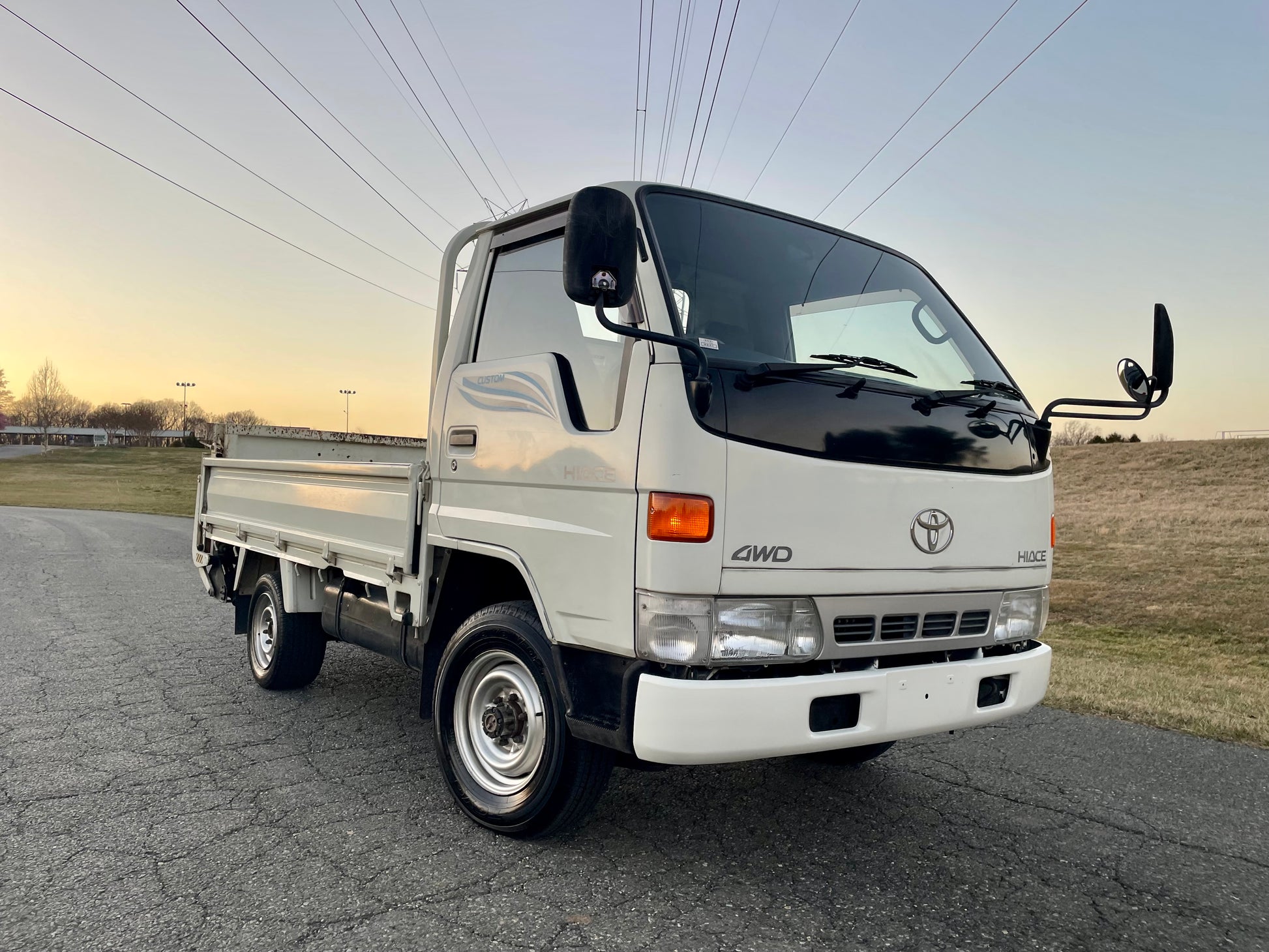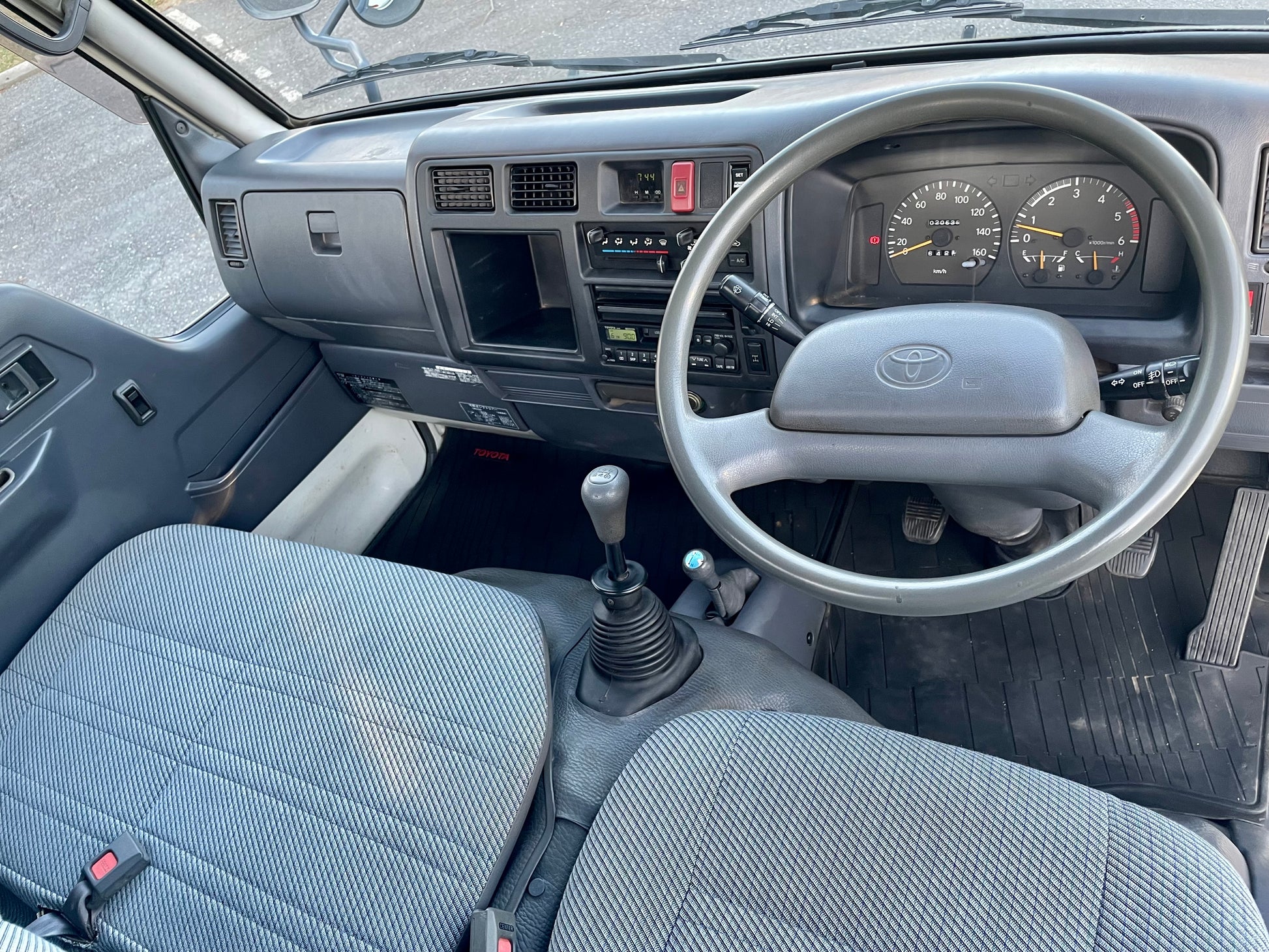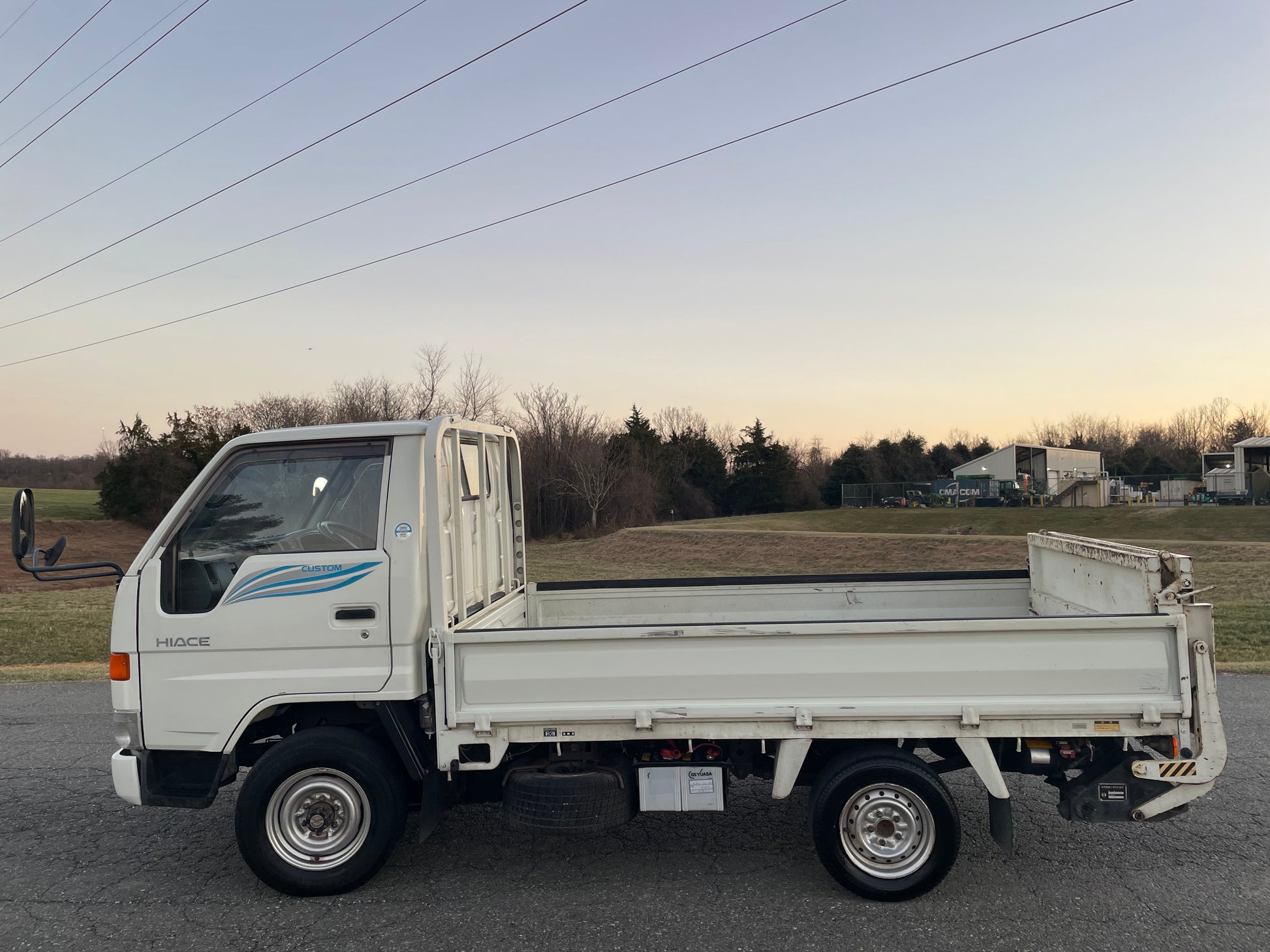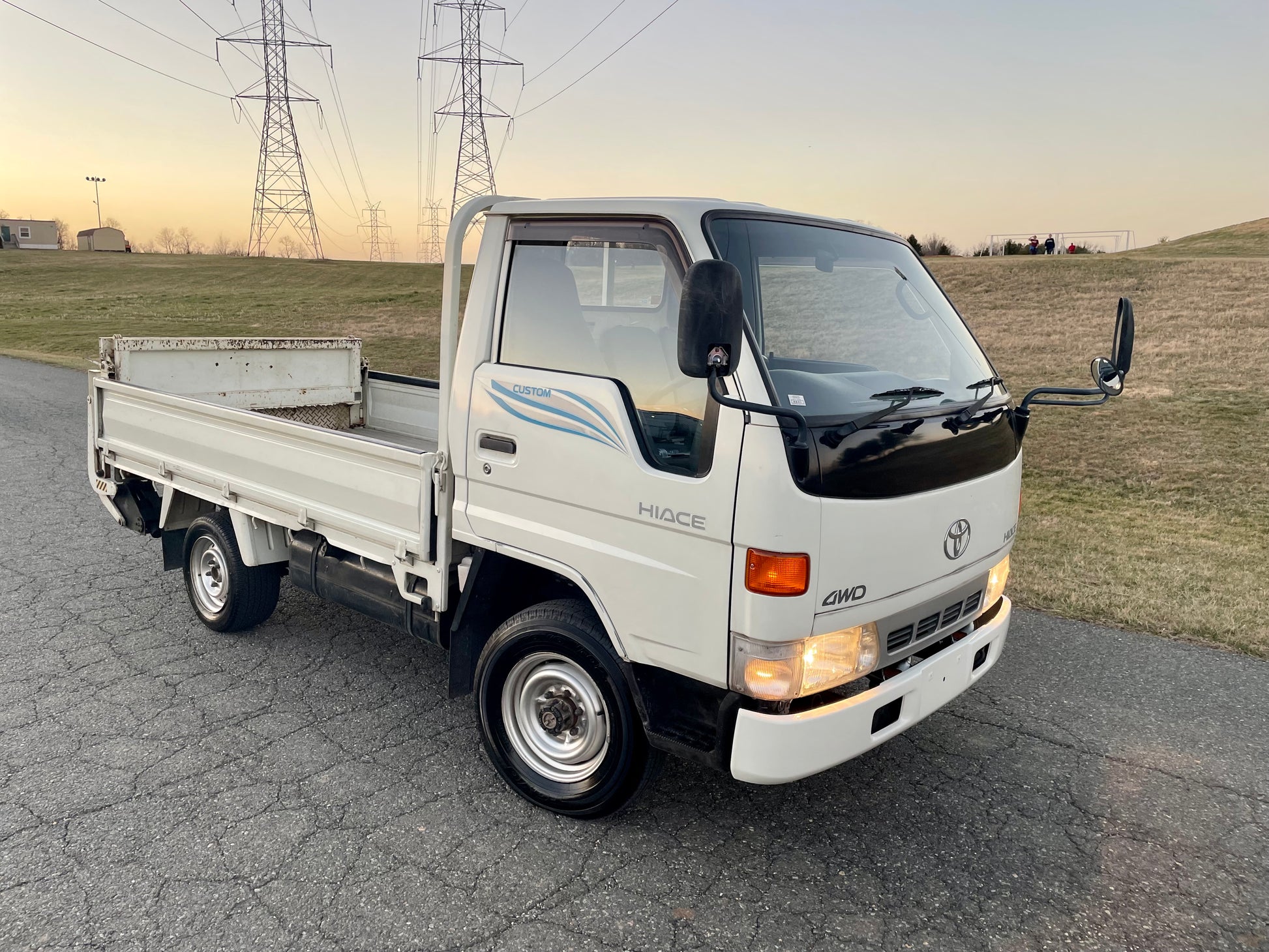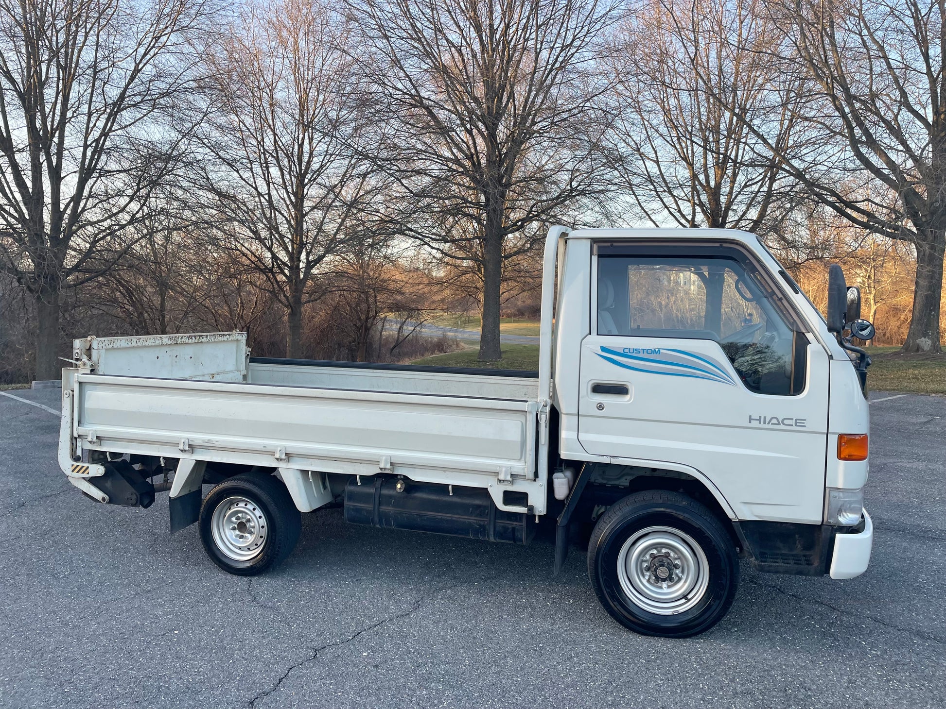 1995 TOYOTA HIACE CUSTOM LY151 —12,749 miles. “3L” 2,779cc, Inline Four, Diesel, 5 Speed Manual Transmission, Floor Shifted 2 Speed Transfer Case, 4WD High And Low Range, Manually Locking Aisin Front Hubs, White Paint, Vinyl Upholstery, A/C, Heat, Electric Windows, Drop-Side Cargo Bed, Bulkhead Bar, TOYOTA TECS Hydraulic Liftgate, Load Capacity of 1050KG