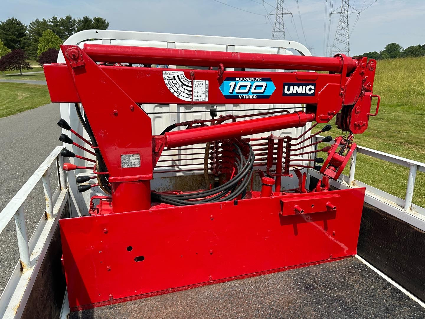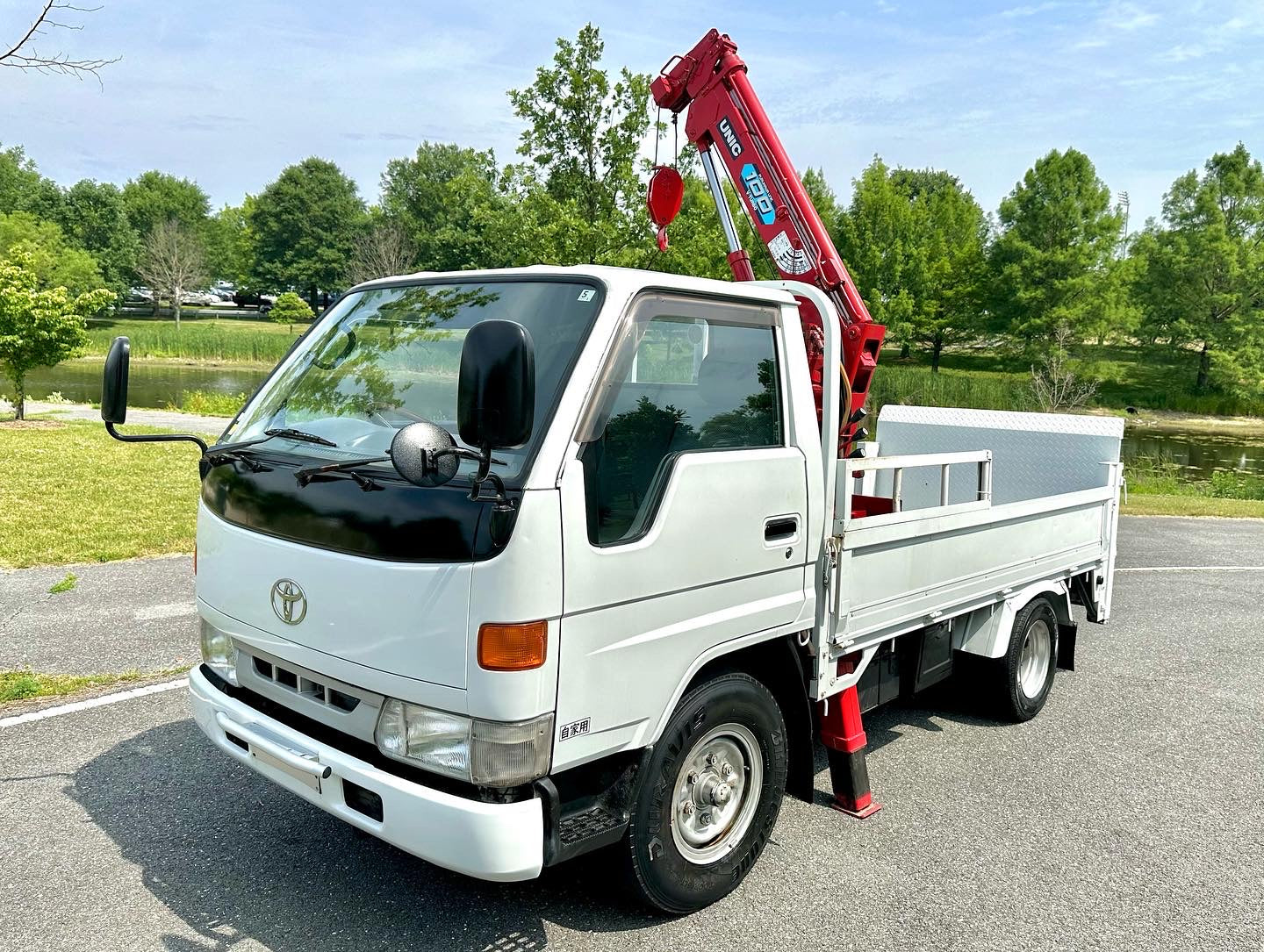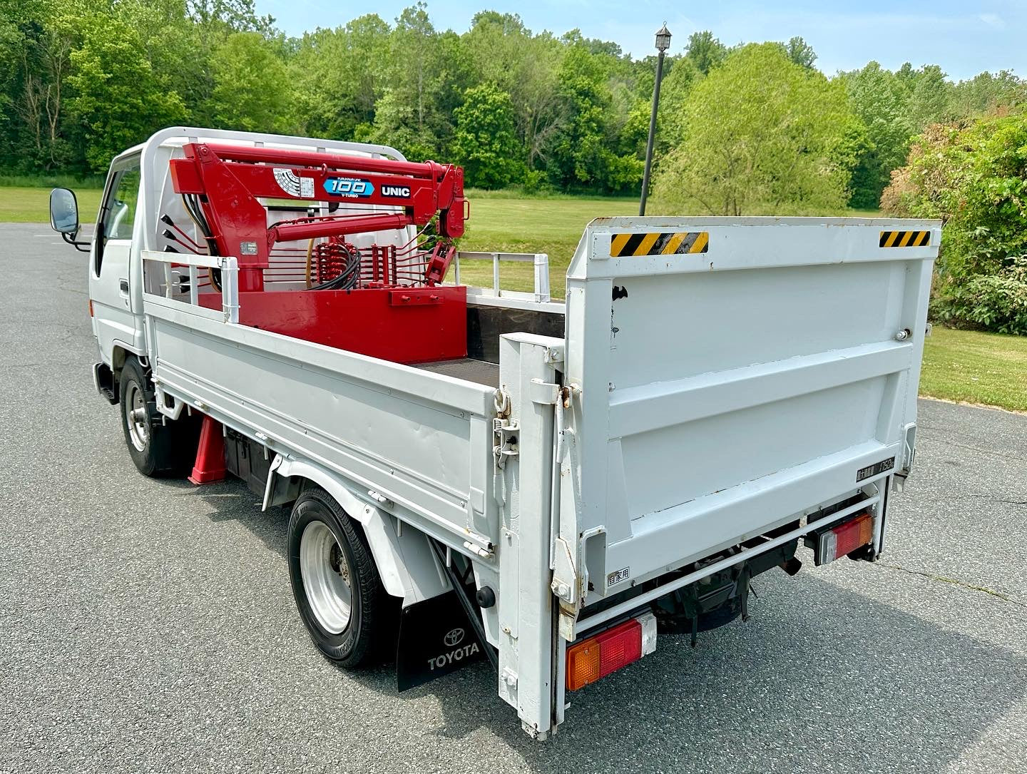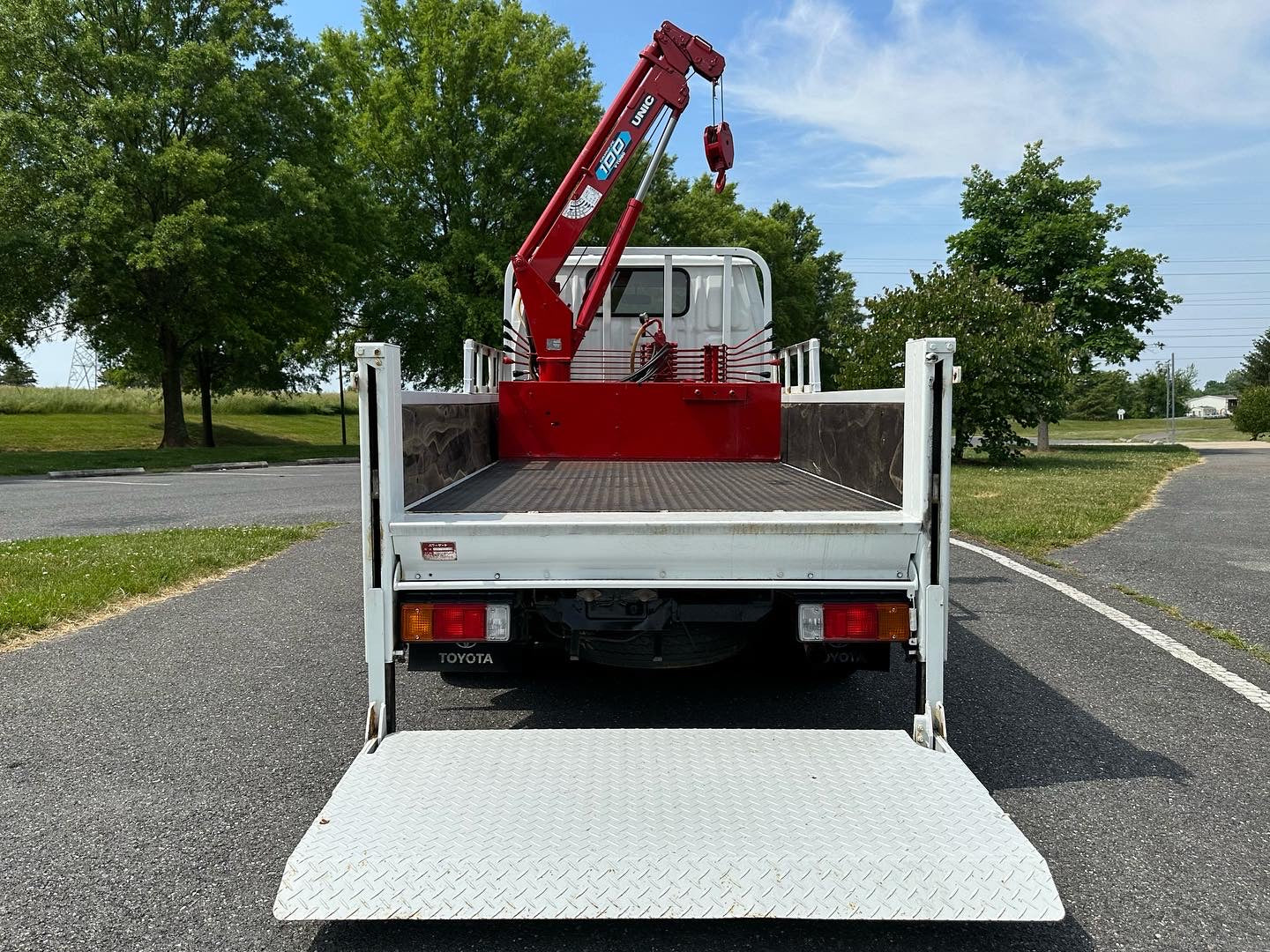 1996 TOYOTA DYNA BU102 —120,420 miles. “15B-F” 4,104cc, Inline Four, Diesel, 4 Speed Automatic Transmission With Over Drive, Dually Tires, White Paint, Vinyl Upholstery, A/C, Heat, Electric Windows, Drop-Side Cargo Bed, Bulkhead Bar, Hydraulic Liftgate, Furukawa UNIC Boom Crane With a Lifting Capacity of 995kg, Load Capacity of 1750KG.