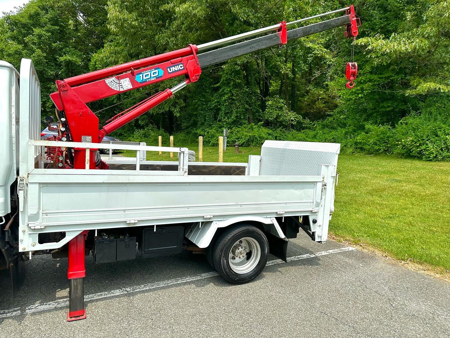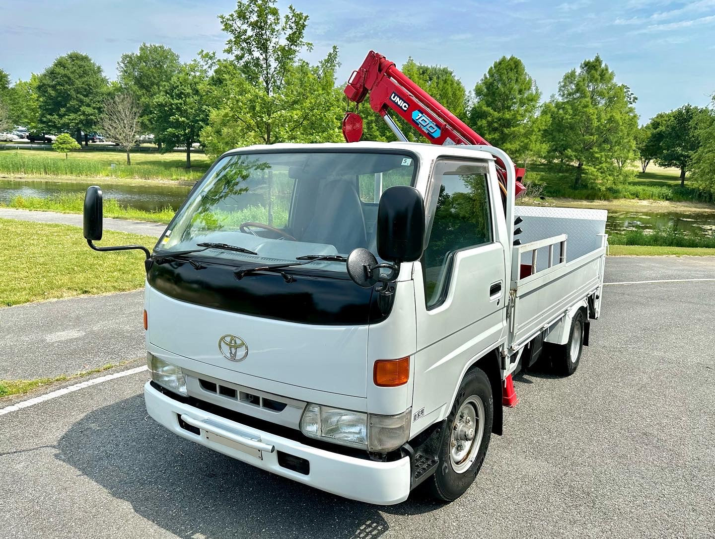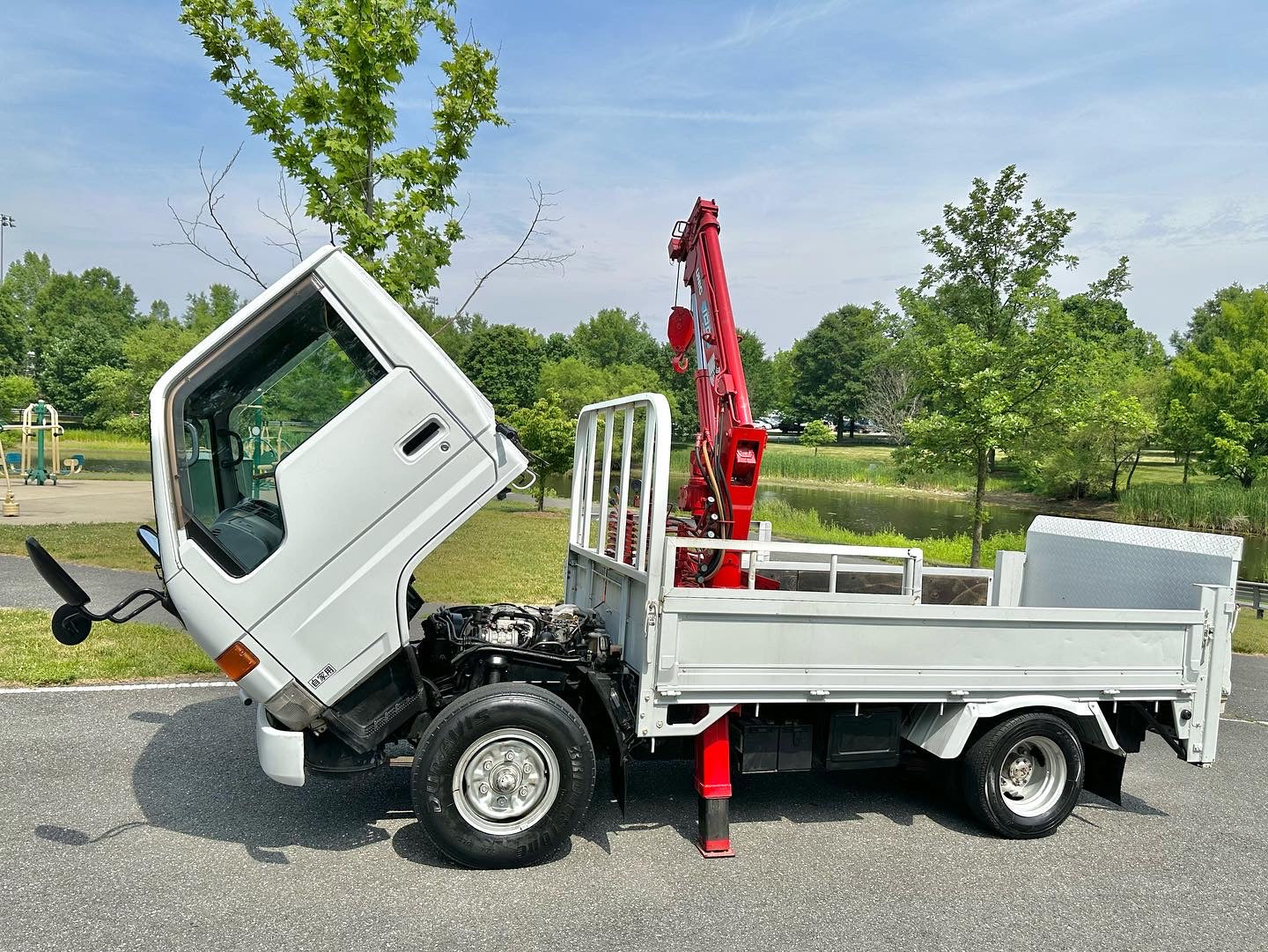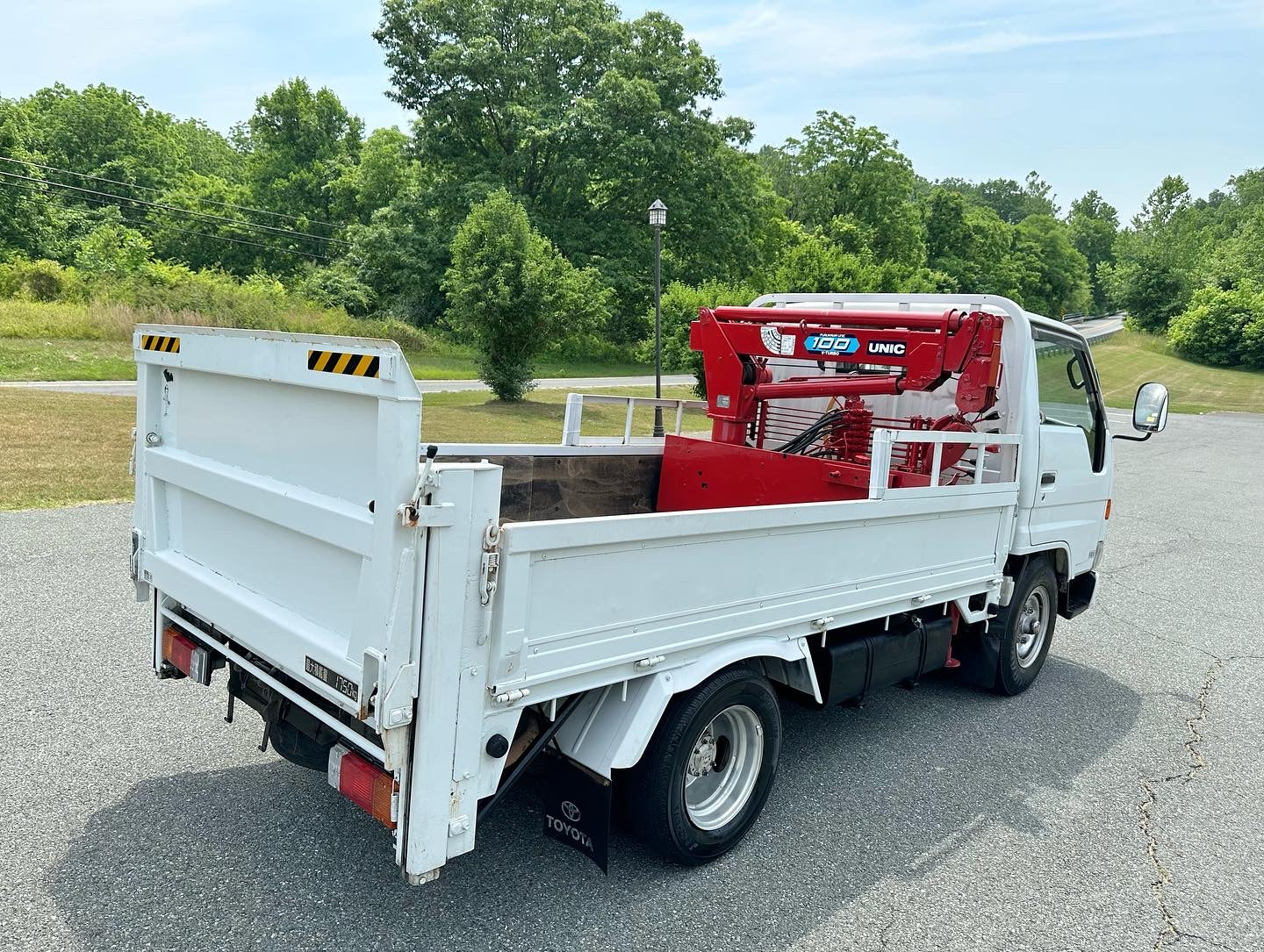 1996 TOYOTA DYNA BU102 —120,420 miles. “15B-F” 4,104cc, Inline Four, Diesel, 4 Speed Automatic Transmission With Over Drive, Dually Tires, White Paint, Vinyl Upholstery, A/C, Heat, Electric Windows, Drop-Side Cargo Bed, Bulkhead Bar, Hydraulic Liftgate, Furukawa UNIC Boom Crane With a Lifting Capacity of 995kg, Load Capacity of 1750KG.