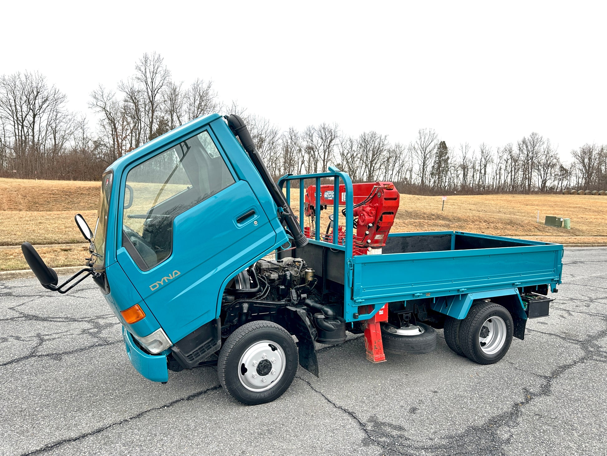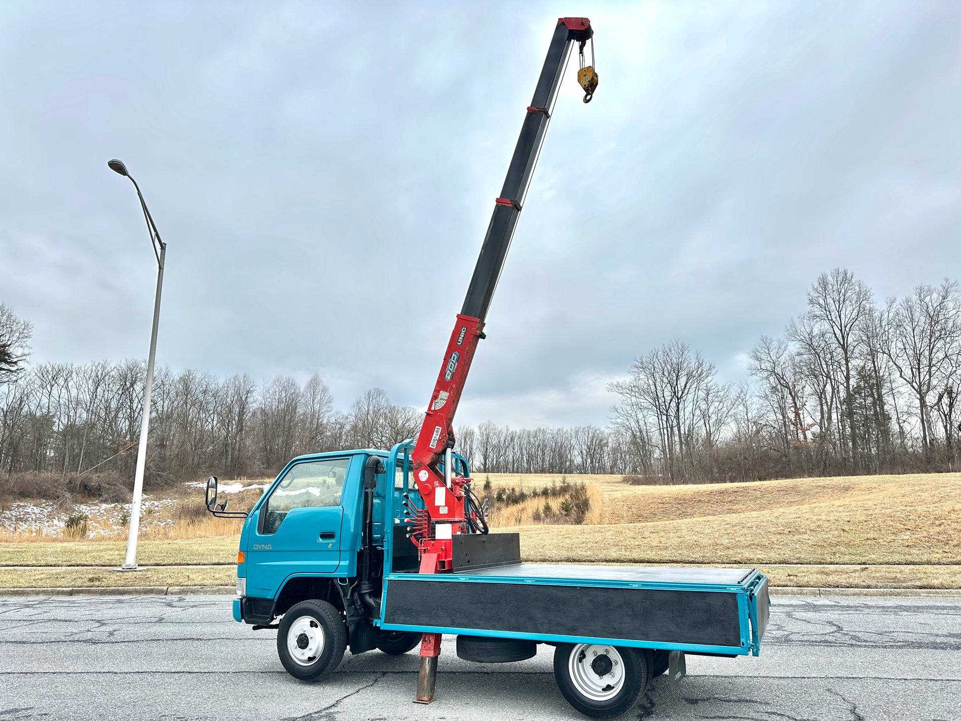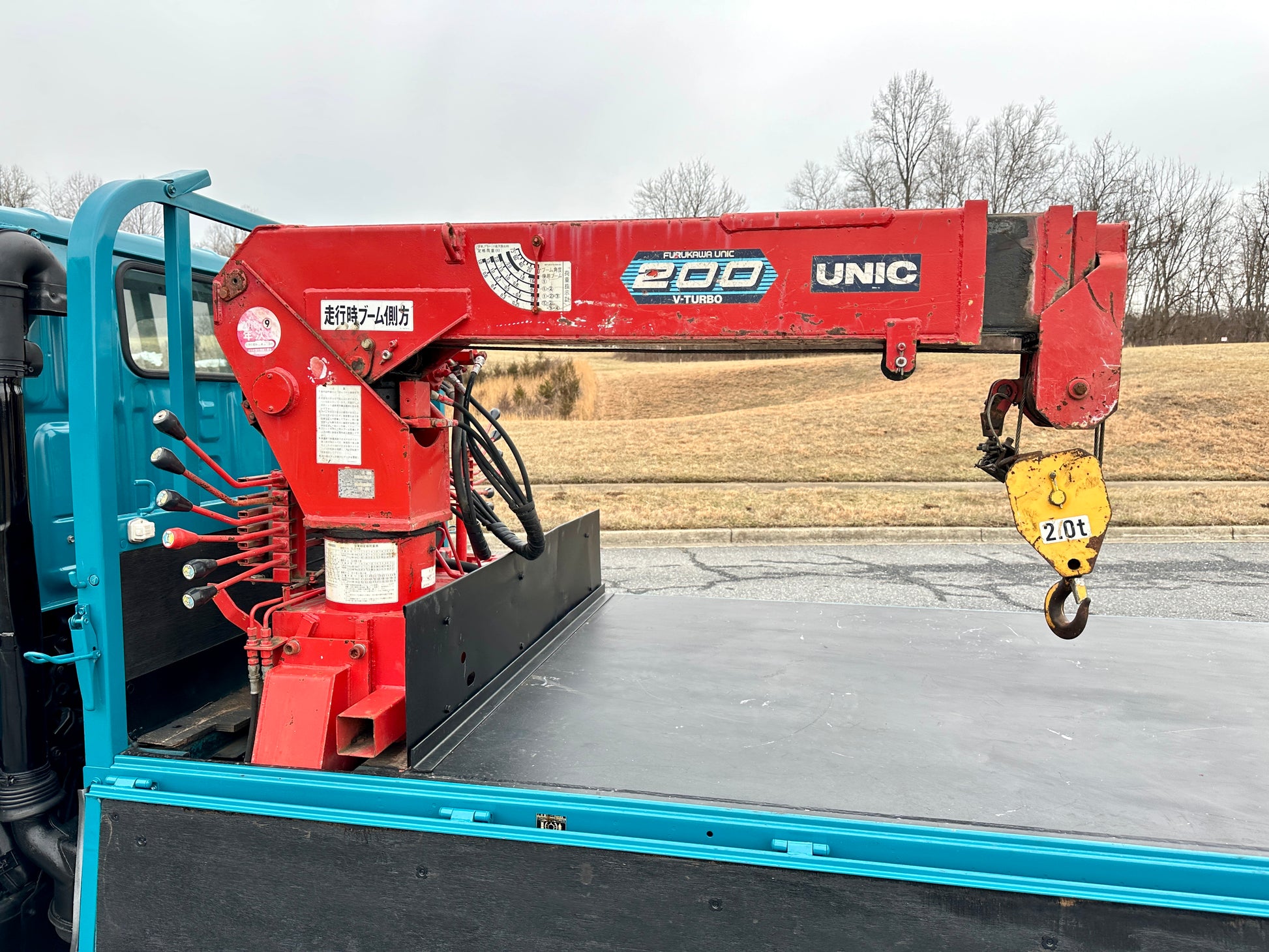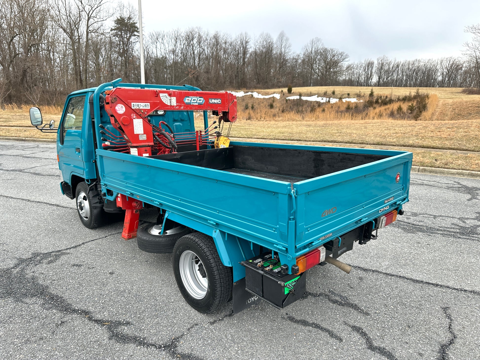 1996 TOYOTA DYNA BU162 — 28,597 miles. “15B-F” 4,104cc, Inline Four, Diesel, 5 Speed Automatic Transmission, Selectable 4WD, 2-Speed Transfer-case With High & Low Ranges, Heavy Duty Solid Axles WIth Leaf-Spring Suspension, Aisin Branded Manually Locking Front Hubs, Dually Tires, Turquoise Paint, Grey Cloth Upholstery, A/C, Heat, Electric Windows, Drop-Side Cargo Bed, Bulkhead Bar, Furukawa UNIC 200 V-Turbo Boom Crane With a Lifting Capacity of 2 Ton, Heavy Duty Stabilizers, Bed Load Capacity Of 2000KG.