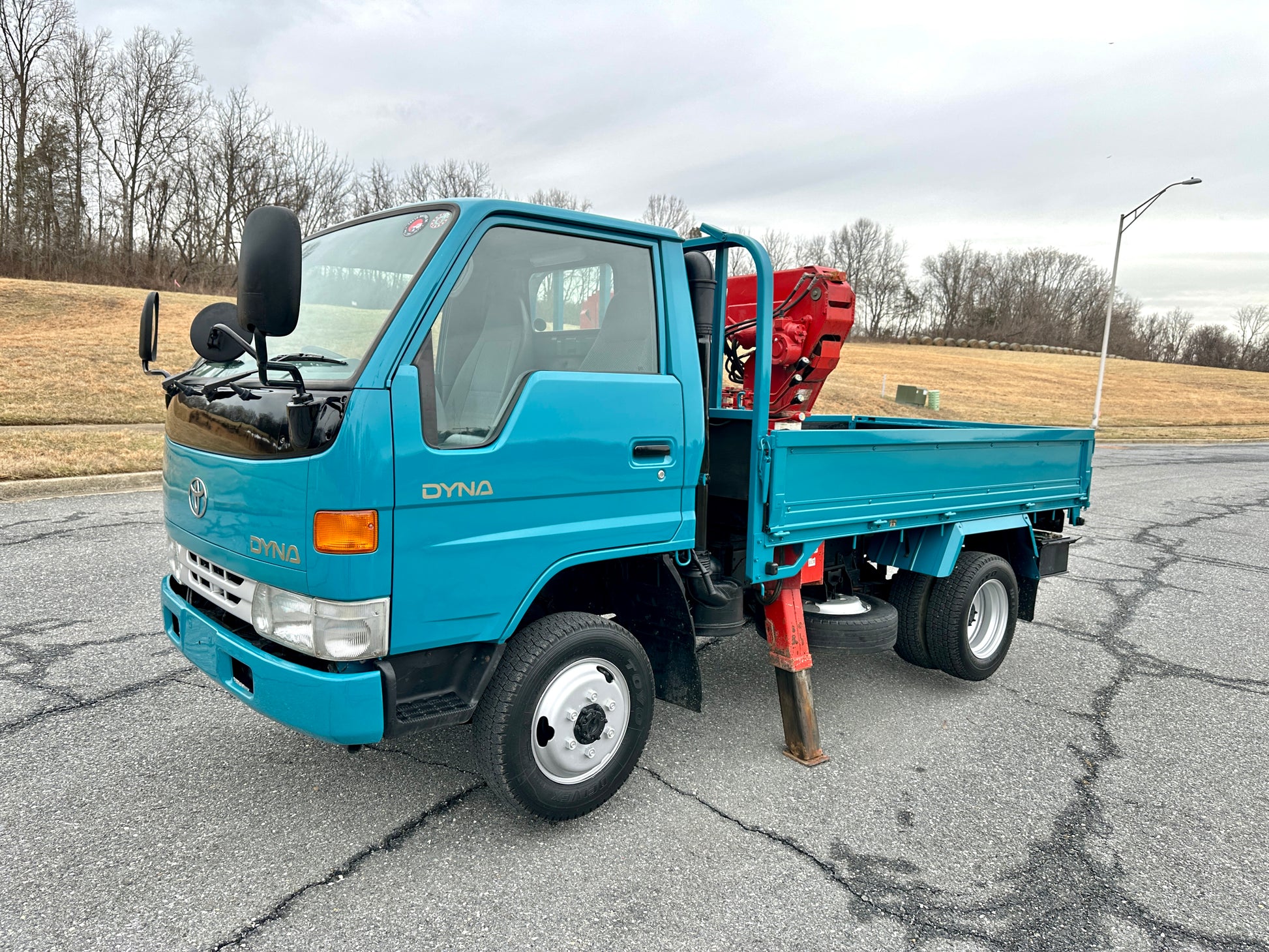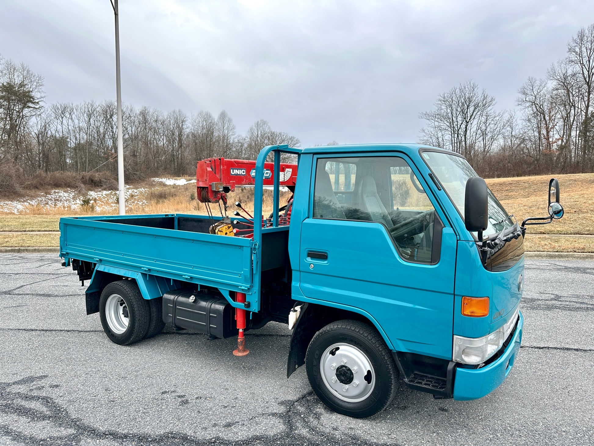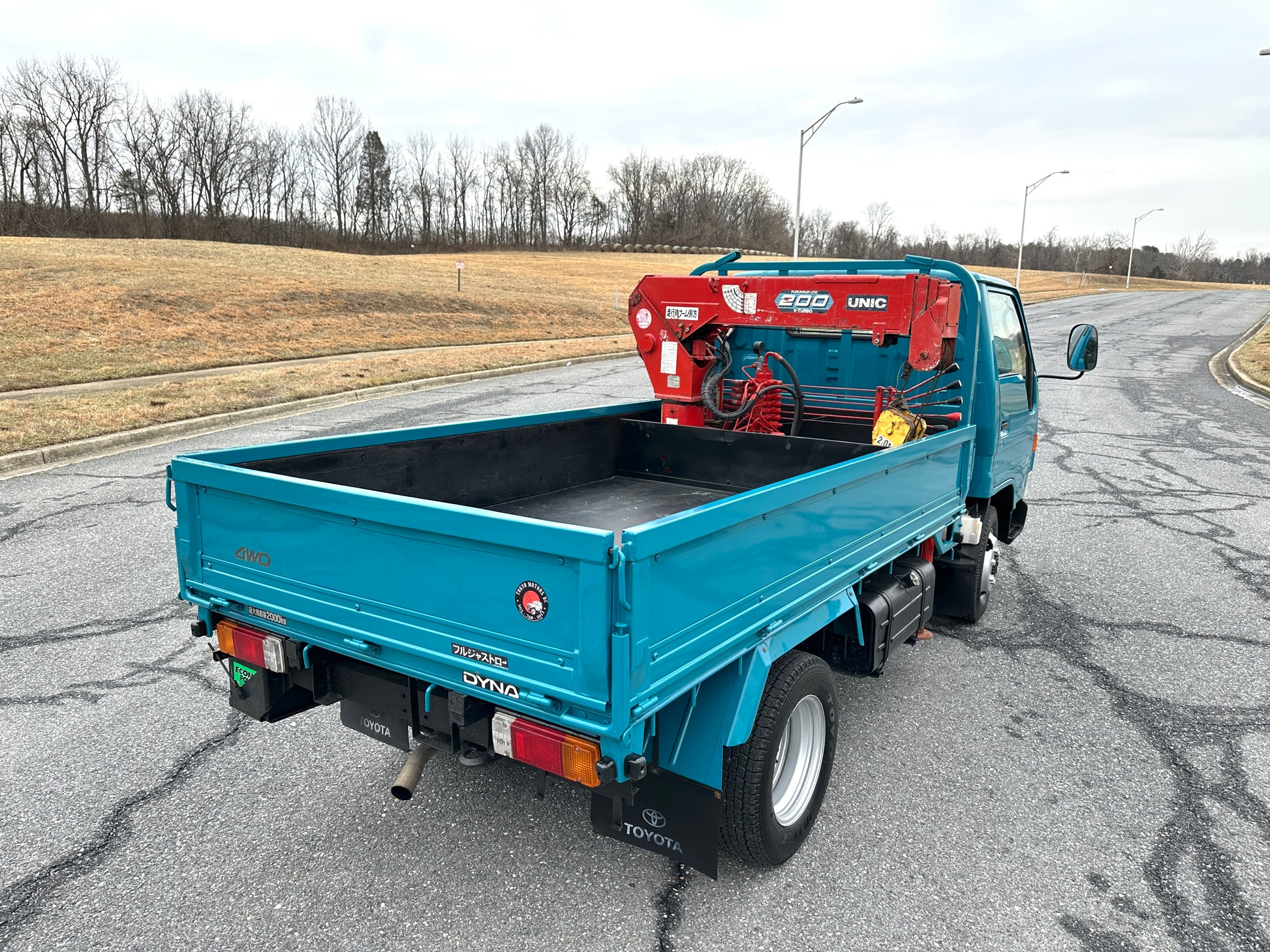 1996 TOYOTA DYNA BU162 — 28,597 miles. “15B-F” 4,104cc, Inline Four, Diesel, 5 Speed Automatic Transmission, Selectable 4WD, 2-Speed Transfer-case With High & Low Ranges, Heavy Duty Solid Axles WIth Leaf-Spring Suspension, Aisin Branded Manually Locking Front Hubs, Dually Tires, Turquoise Paint, Grey Cloth Upholstery, A/C, Heat, Electric Windows, Drop-Side Cargo Bed, Bulkhead Bar, Furukawa UNIC 200 V-Turbo Boom Crane With a Lifting Capacity of 2 Ton, Heavy Duty Stabilizers, Bed Load Capacity Of 2000KG.