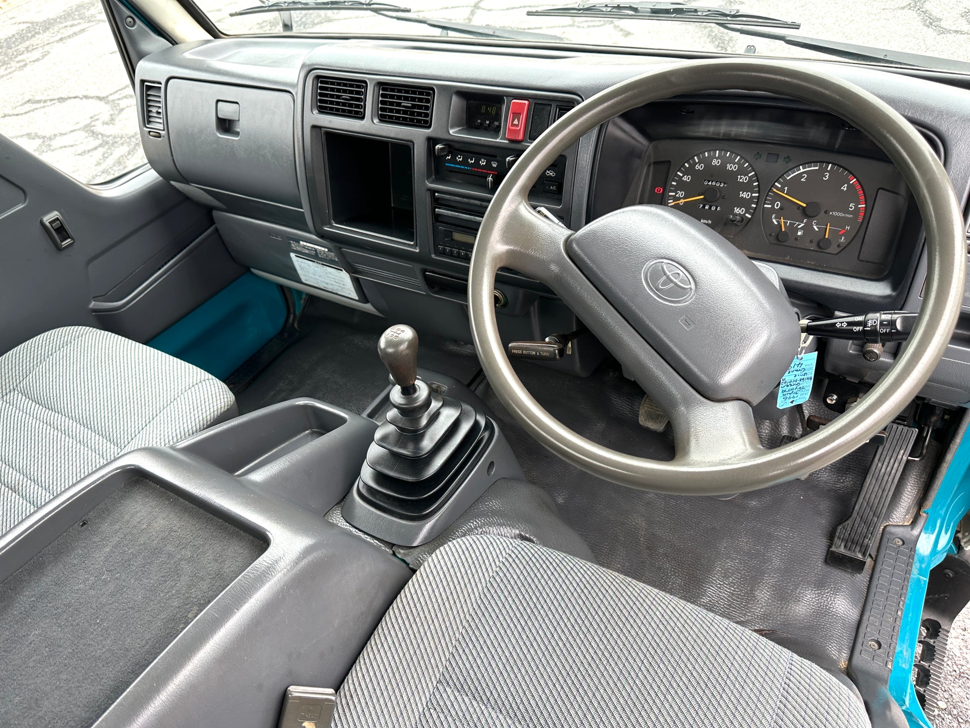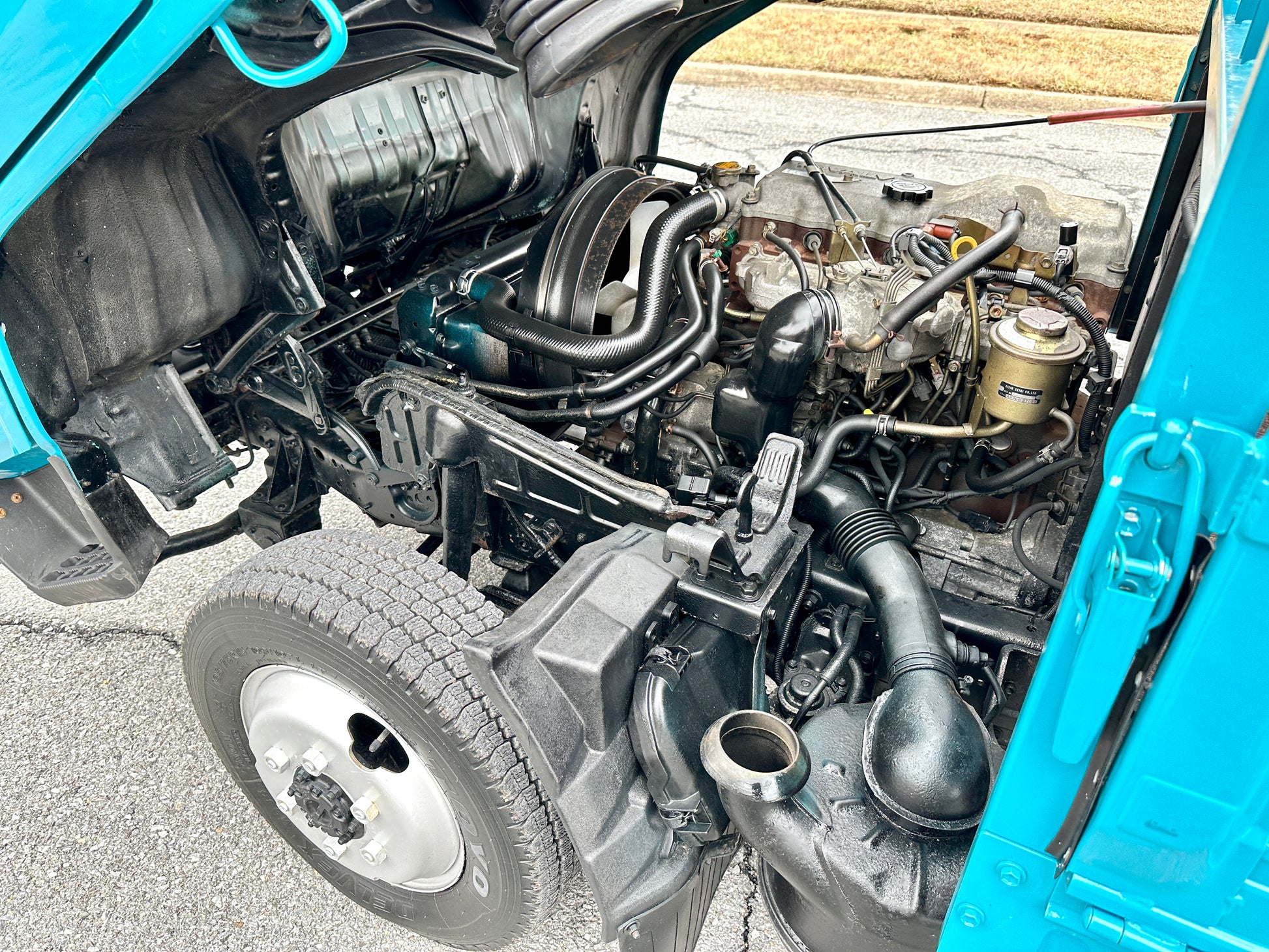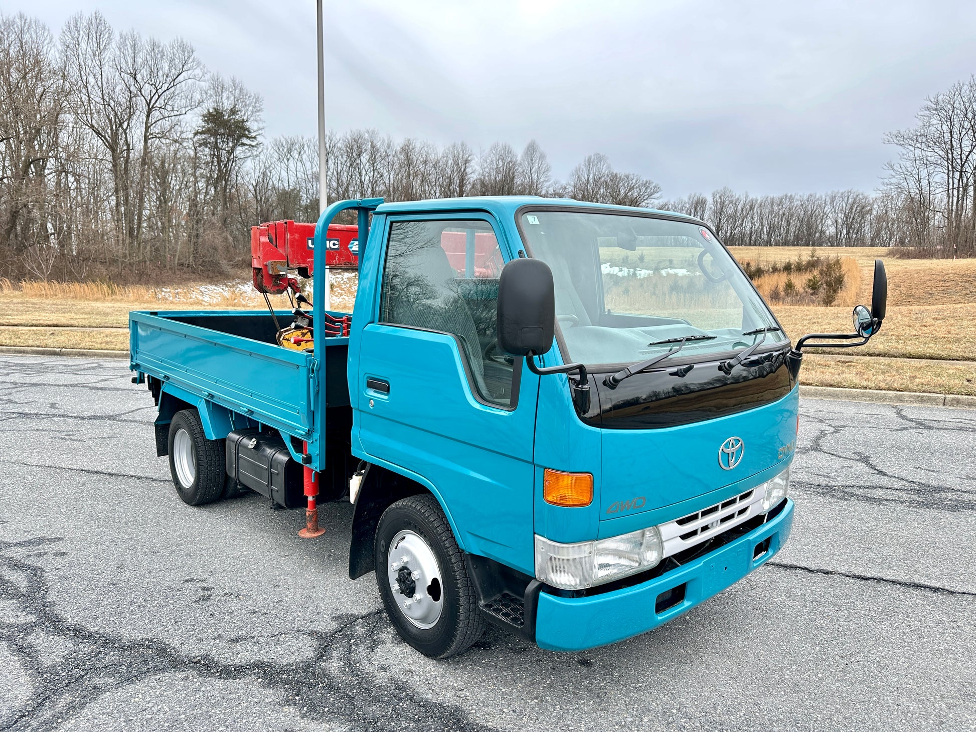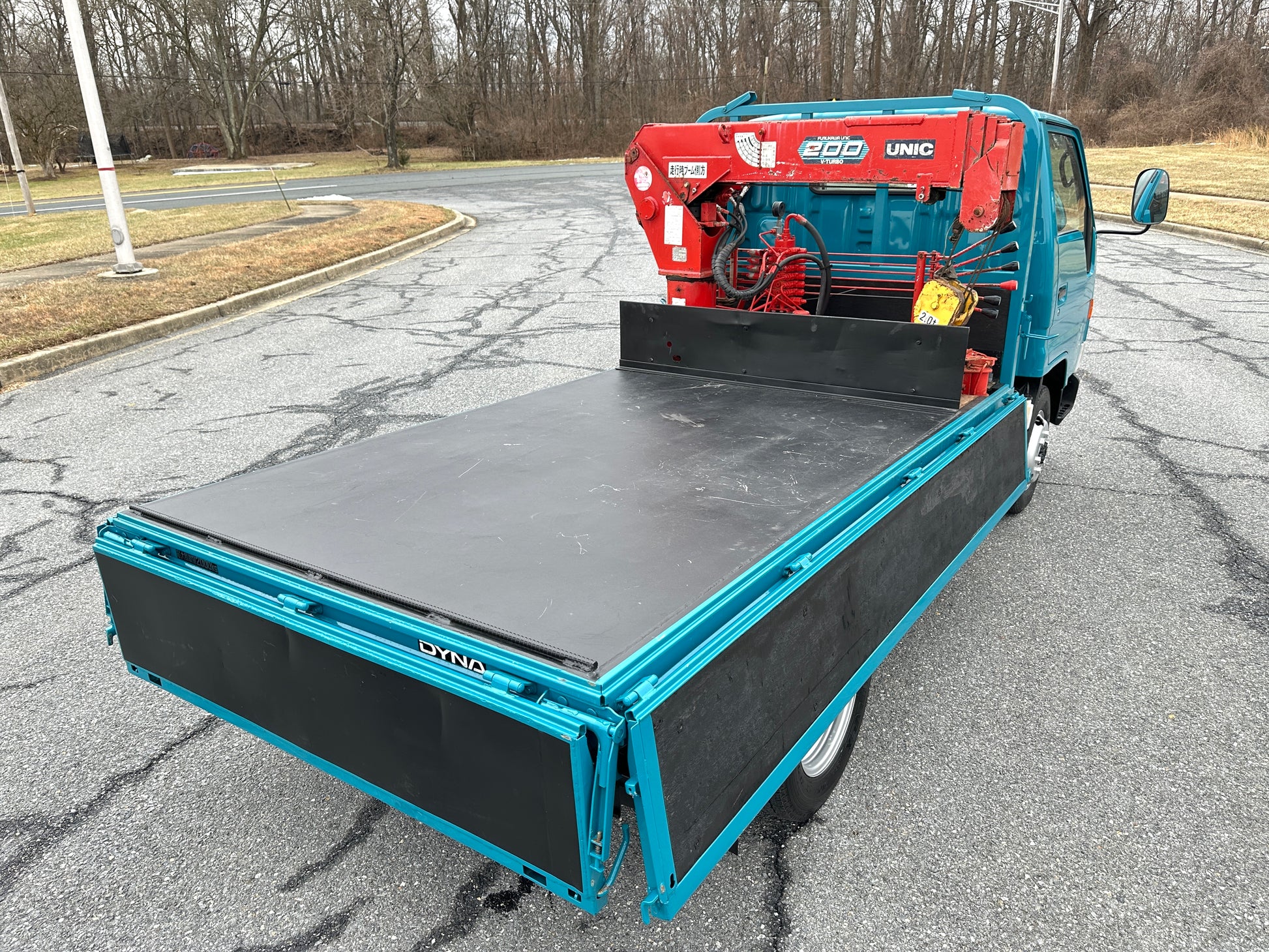 1996 TOYOTA DYNA BU162 — 28,597 miles. “15B-F” 4,104cc, Inline Four, Diesel, 5 Speed Automatic Transmission, Selectable 4WD, 2-Speed Transfer-case With High & Low Ranges, Heavy Duty Solid Axles WIth Leaf-Spring Suspension, Aisin Branded Manually Locking Front Hubs, Dually Tires, Turquoise Paint, Grey Cloth Upholstery, A/C, Heat, Electric Windows, Drop-Side Cargo Bed, Bulkhead Bar, Furukawa UNIC 200 V-Turbo Boom Crane With a Lifting Capacity of 2 Ton, Heavy Duty Stabilizers, Bed Load Capacity Of 2000KG.