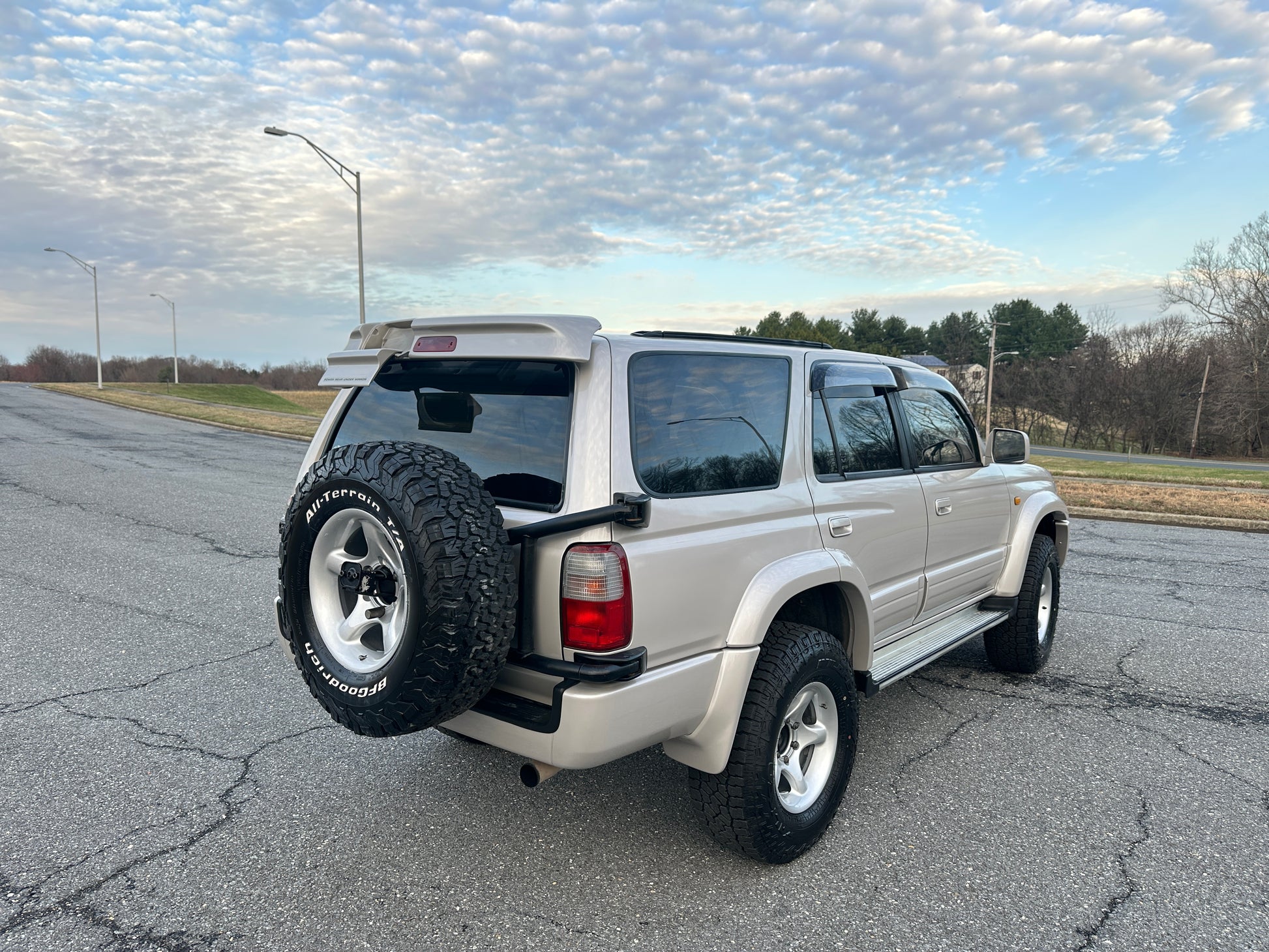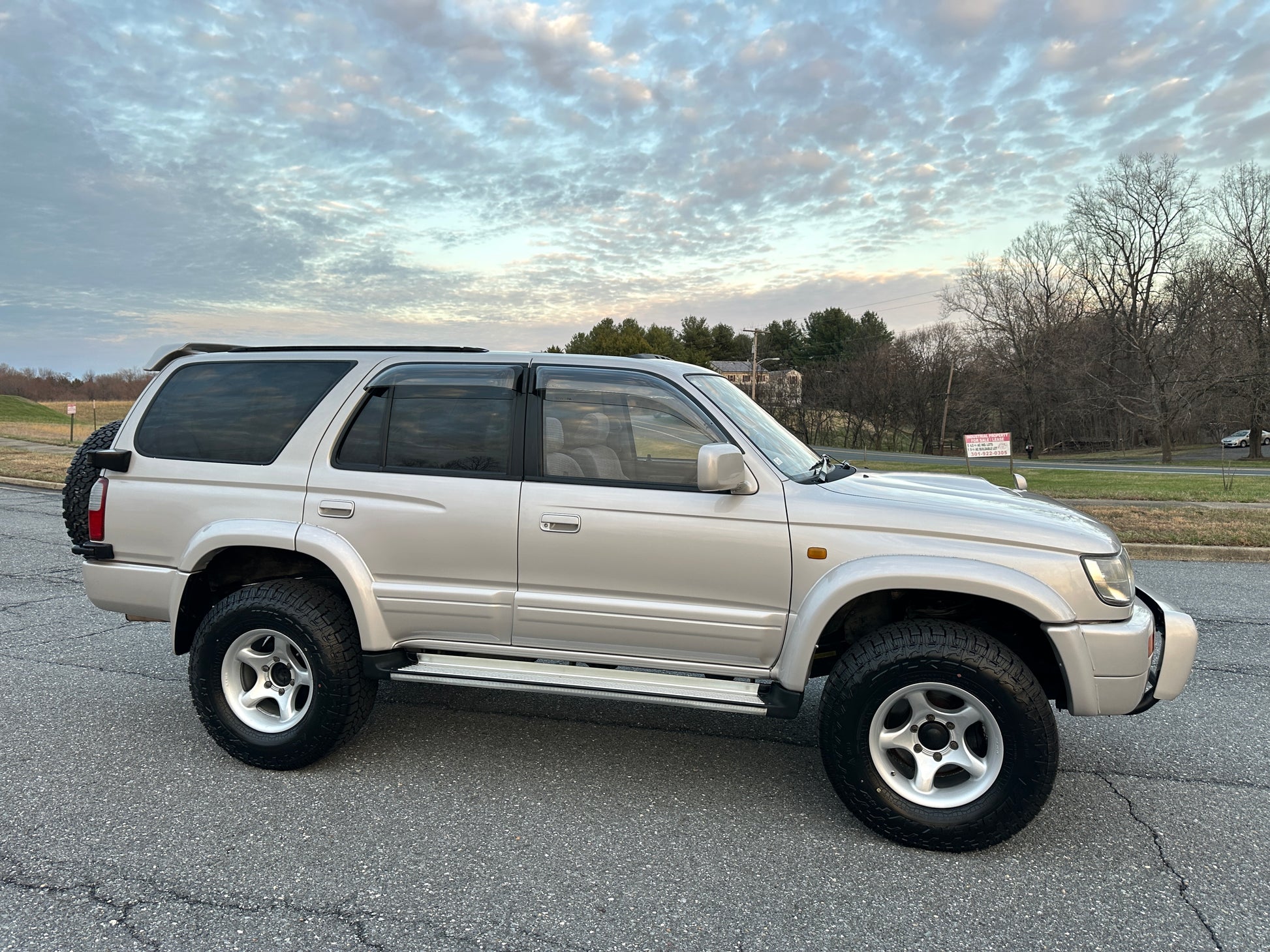1996 Toyota Hilux Surf KZN185 SSR-G ——155,079 Miles, “1KZ-TE” 3.0 Liter Inline 4, Intercooled Turbo Diesel, Automatic Transmission, Transfer Case With High And Low Ranges, Selectable 4WD, Locking Center Differential, Desert Dune Metallic Paint, Blue Patterned Cloth Upholstery, ABS, SRS Airbag, Power Windows, Power Locks, Power Back Glass, Power Folding Mirrors, Power Retractable Rear Back-Up Mirror, Automatic Dual-Zone Climate Control, JDM Wheels Wrapped In Brand New Falken Wildpeak A/T 4W Tires, Dual Batteries With Idle-Up Switch, Swing-Out Spare Tire Carrier With Matching Wheel, Factory Bash-Bar, New Batteries, New Tires.