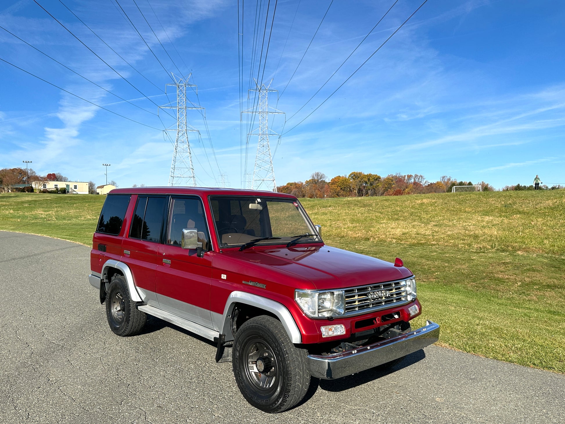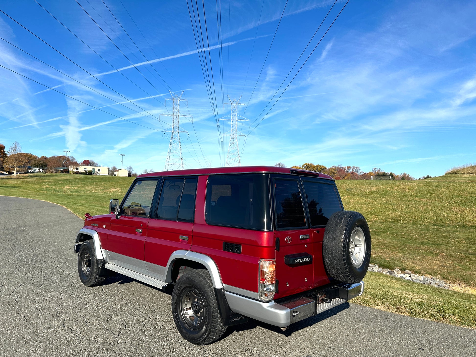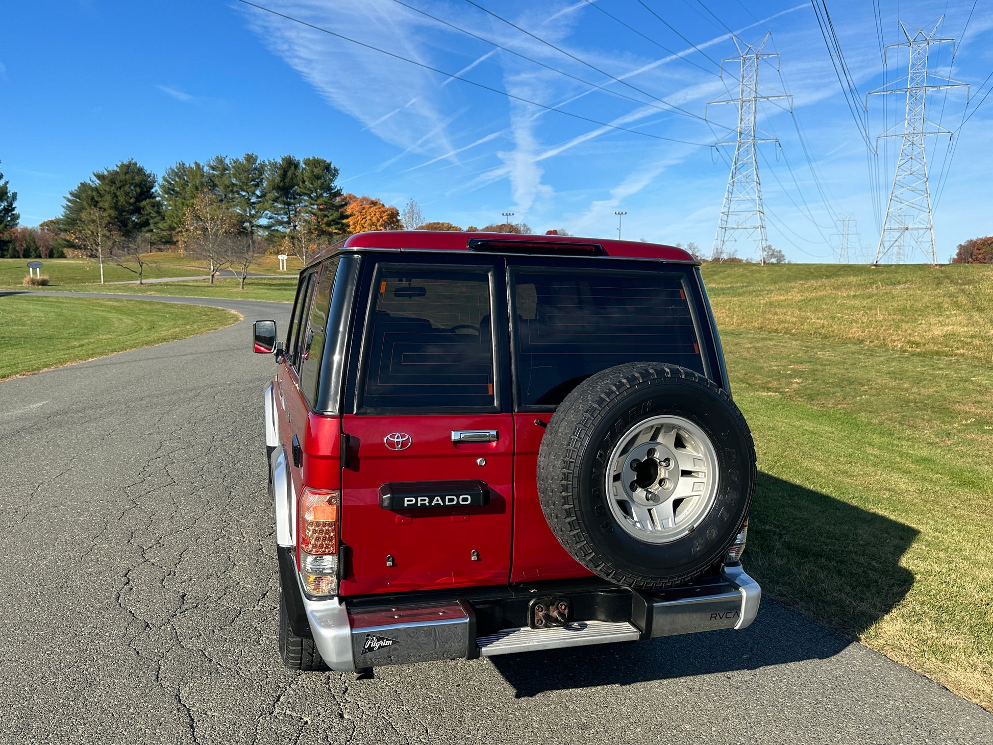1996 Toyota Land Cruiser Prado KZJ78——131,997 miles, “1KZ-TE” 3.0 Liter Inline 4, Turbo Diesel, Automatic Transmission, Selectable 4WD, Transfer Case With High And Low Ranges, Locking Center Differential, Red Pearl / Oyster Pearl Paint (25Z), Brown Cloth Upholstery, Chrome Bumpers, OEM Toyota Wheels , Power Locking Front Hubs, Running Boards, Aftermarket Radio, 3rd Row Seats, OEM,Power Windows, Power Locks, Power Adjusting Mirrors, Automatic Dual-Zone Climate Control.