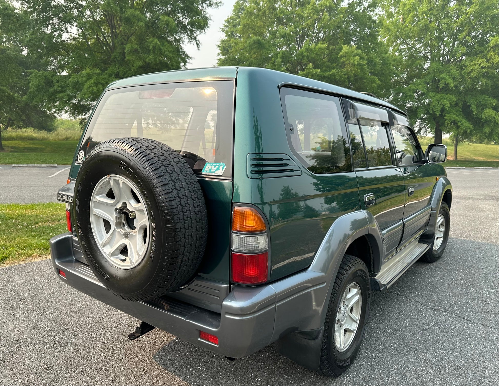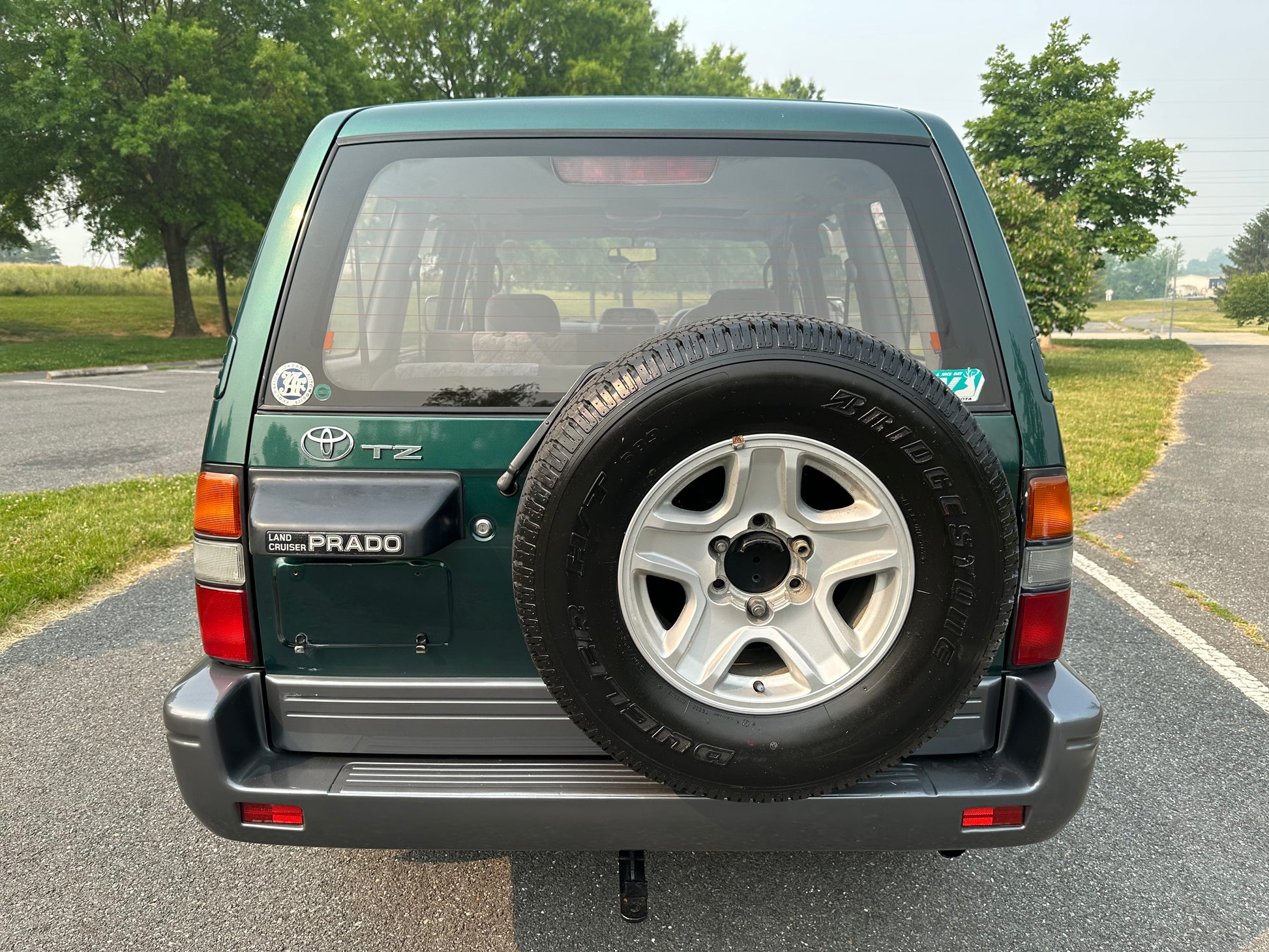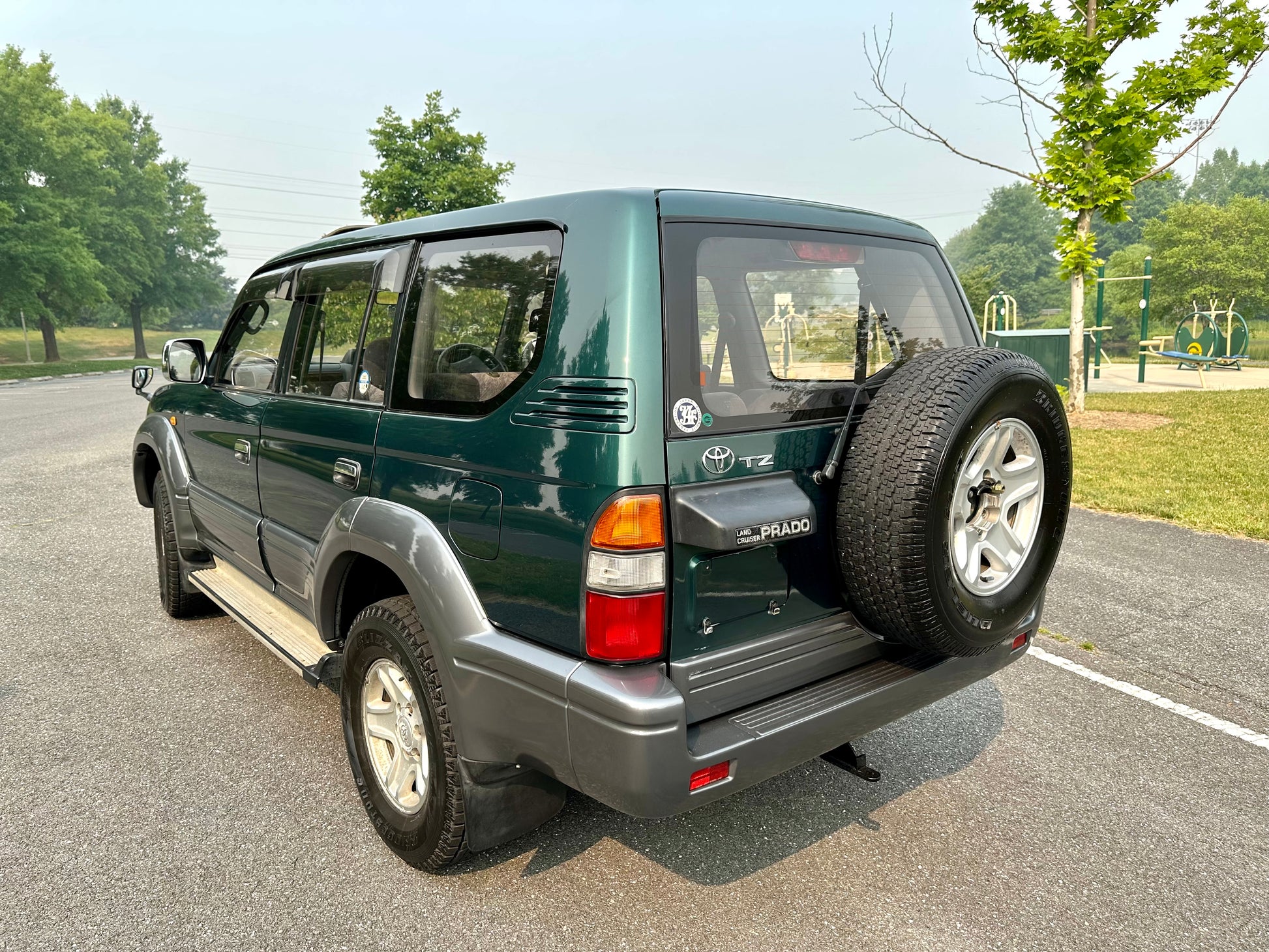 1996 Toyota Land Cruiser Prado TZ KZJ95——126,896 Miles, “1KZ-TE” 3.0 Liter Inline 4, Turbo Diesel, Automatic Transmission, Transfer Case With High And Low Ranges, Full-Time 4WD, Locking Center Differential, Deep Jewel Green Metallic/ Gray Metallic Two-Tone (K12), Patterned Blue Cloth Upholstery, SUNROOF, REAR OVERHEAD A/C VENTS, 3RD ROW SEATS, OEM Wheels, OEM Rainguards, ABS, Dual SRS Airbags, Field Monitor System, Power Windows, Power Locks, Power Folding Mirrors, Automatic Dual-Zone Climate Control.