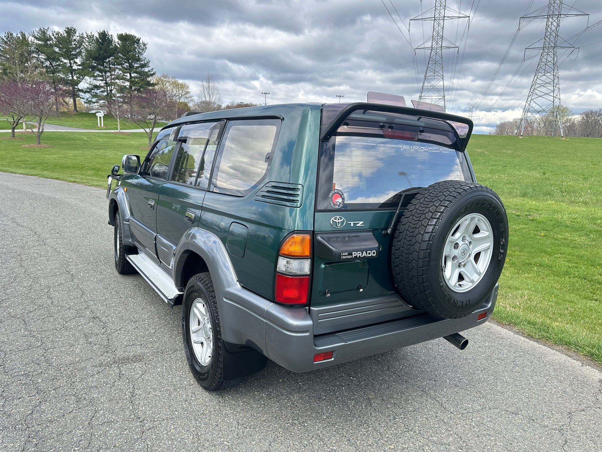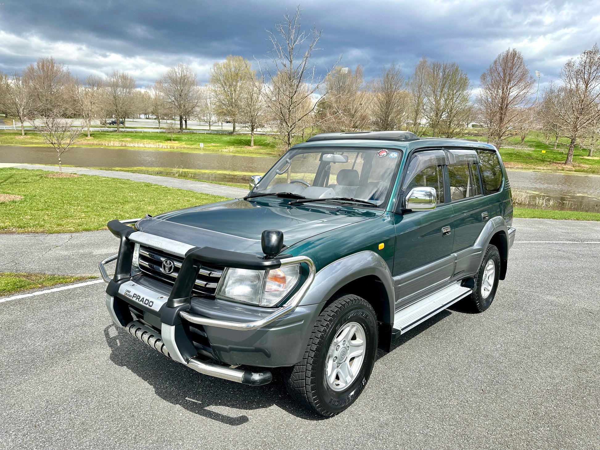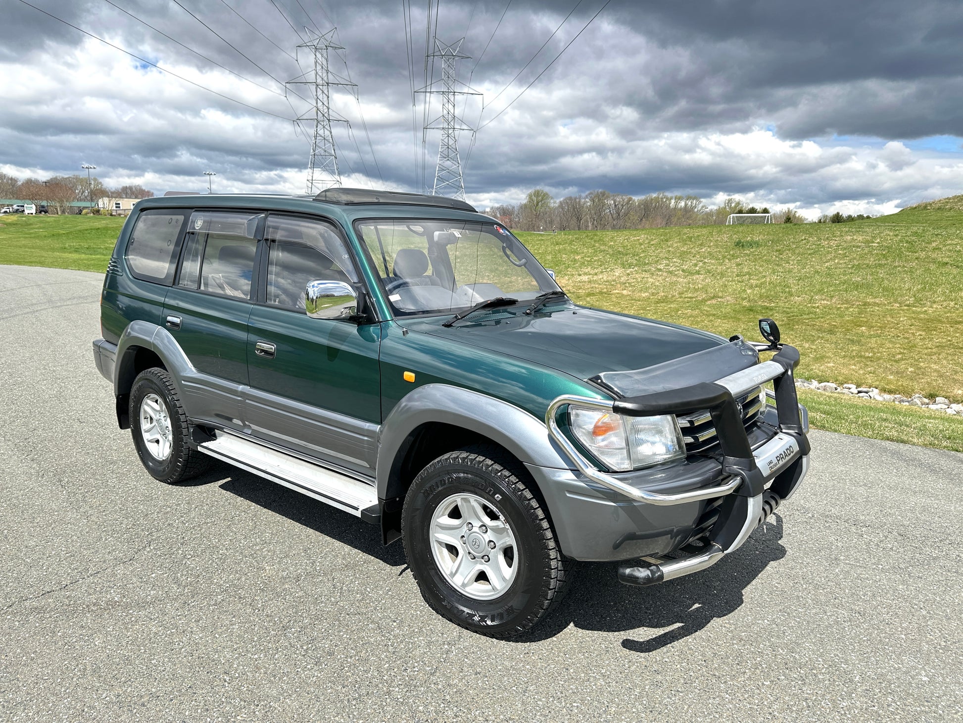 1997 Toyota Land Cruiser Prado TZ KZJ95——73,751 Miles, “1KZ-TE” 3.0 Liter Inline 4, Turbo Diesel, Automatic Transmission, Transfer Case With High And Low Ranges, Full-Time 4WD, Locking Center Differential, Deep Jewel Green Metallic/ Gray Metallic Two-Tone (K12), Patterned Blue Cloth Upholstery With Wood Trim, SUNROOF, REAR OVERHEAD A/C VENTS, 3RD ROW SEATS, CENTER DIFF LOCK, Front Bull-Bar, OEM Rainguards, ABS, Dual SRS Airbags, Field Monitor System, Power Windows, Power Locks, Power Folding Mirrors, Automatic Dual-Zone Climate Control, OEM AIR PURIFIER, WIND DEFLECTORS ON THE HOOD AND SUNROOF, SPOILER.
