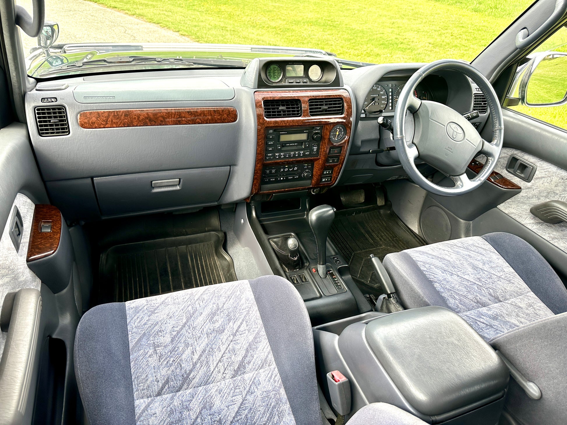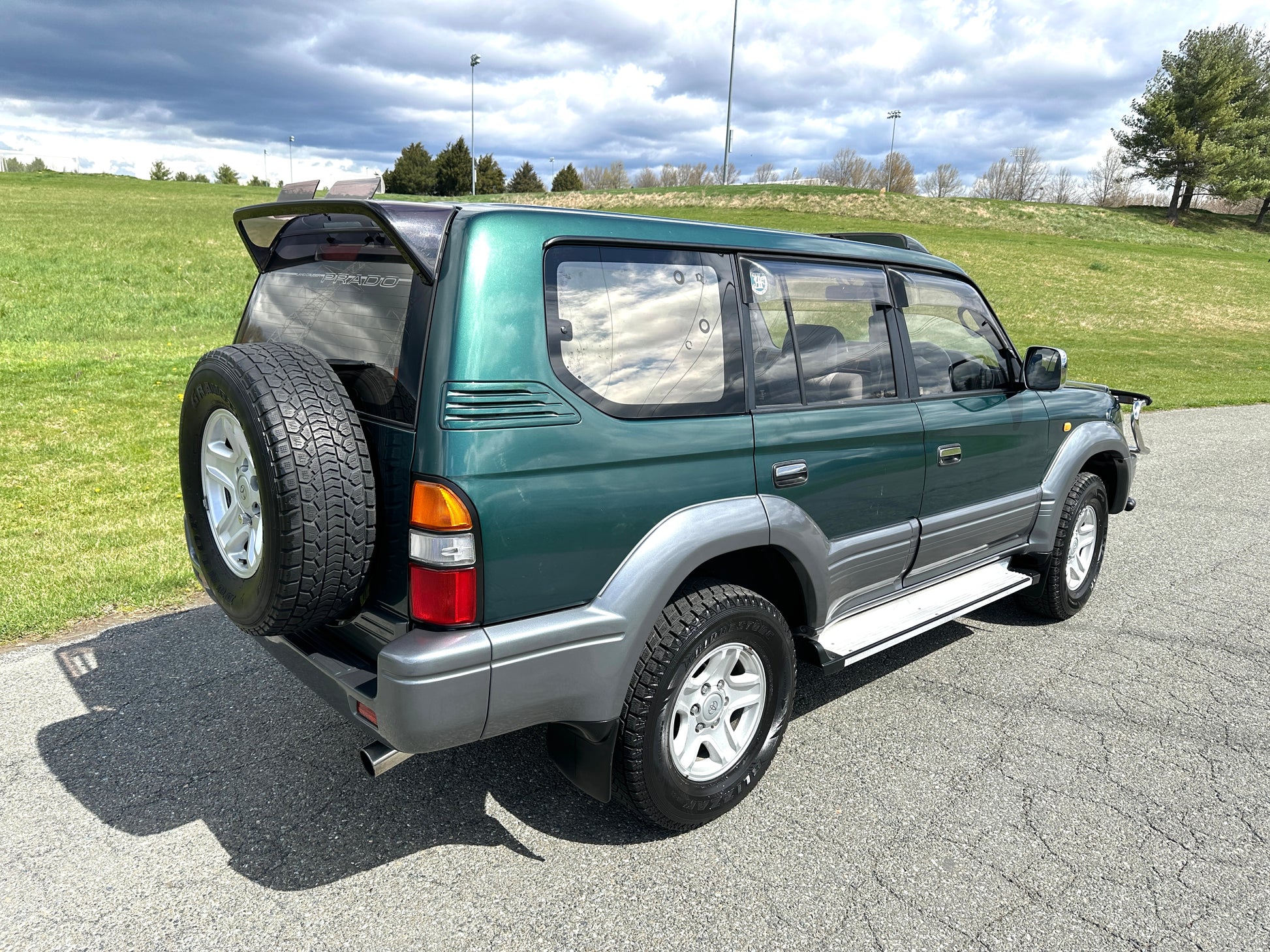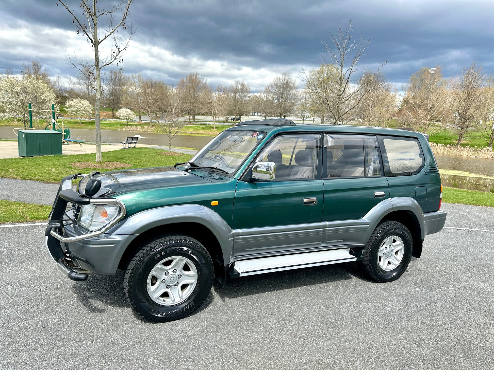 1997 Toyota Land Cruiser Prado TZ KZJ95——73,751 Miles, “1KZ-TE” 3.0 Liter Inline 4, Turbo Diesel, Automatic Transmission, Transfer Case With High And Low Ranges, Full-Time 4WD, Locking Center Differential, Deep Jewel Green Metallic/ Gray Metallic Two-Tone (K12), Patterned Blue Cloth Upholstery With Wood Trim, SUNROOF, REAR OVERHEAD A/C VENTS, 3RD ROW SEATS, CENTER DIFF LOCK, Front Bull-Bar, OEM Rainguards, ABS, Dual SRS Airbags, Field Monitor System, Power Windows, Power Locks, Power Folding Mirrors, Automatic Dual-Zone Climate Control, OEM AIR PURIFIER, WIND DEFLECTORS ON THE HOOD AND SUNROOF, SPOILER.