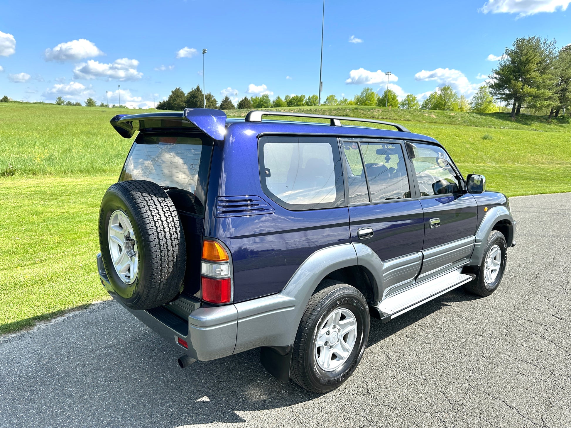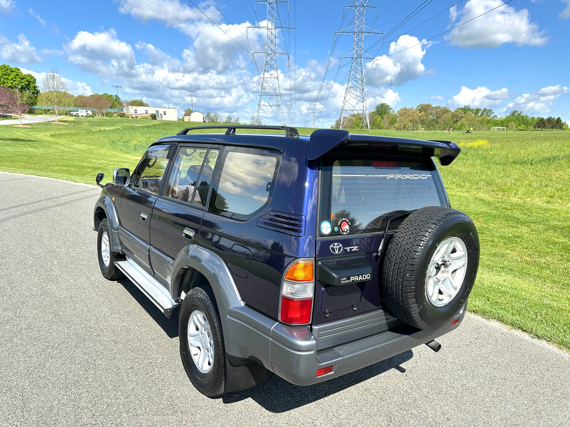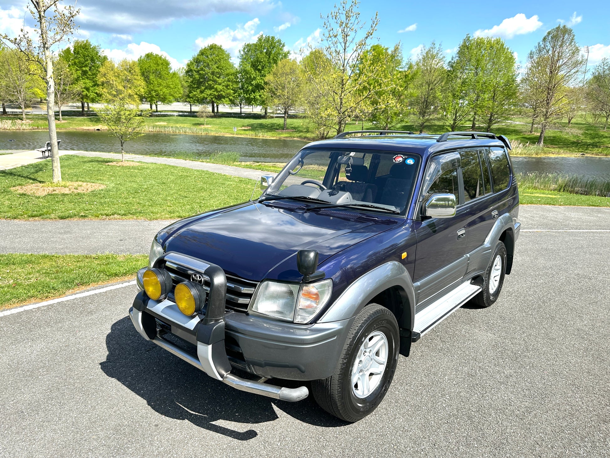 1997 Toyota Land Cruiser Prado TZ KZJ95——124,933 Miles, “1KZ-TE” 3.0 Liter Inline 4, Turbo Diesel, Automatic Transmission, Transfer Case With High And Low Ranges, Full-Time 4WD, Locking Center Differential, Stellar Blue Pearl / Gray Metallic Two-Tone (K14), Patterned Blue Cloth Upholstery With Wood Trim, SUNROOF, REAR OVERHEAD A/C VENTS, 3RD ROW SEATS, CENTER DIFF LOCK, Front Bull-Bar With Fog Lights, Rear Spoiler, OEM Rainguards, ABS, Dual SRS Airbags, Field Monitor System, Power Windows, Power Locks, Power Folding Mirrors, Automatic Dual-Zone Climate Control.