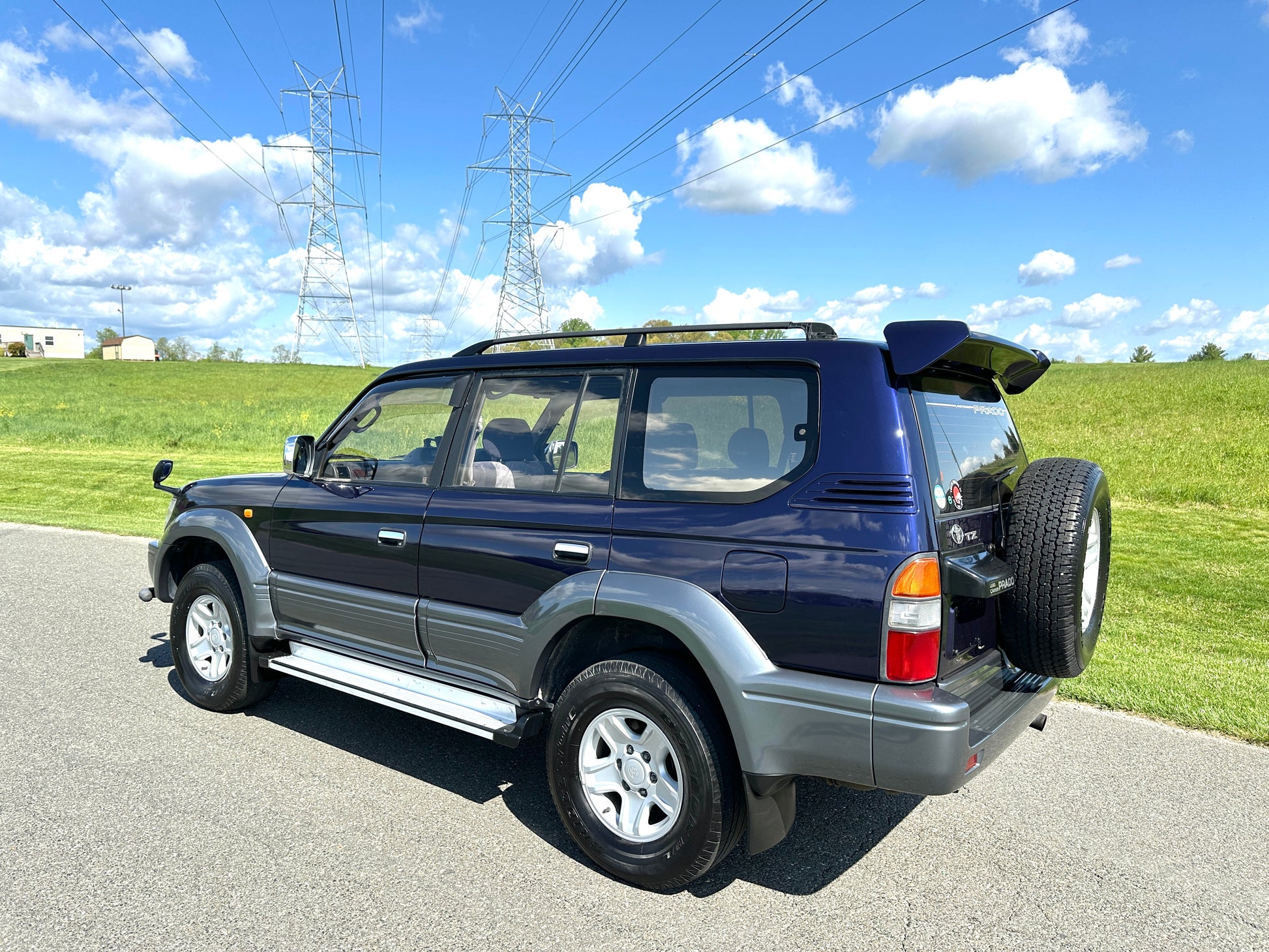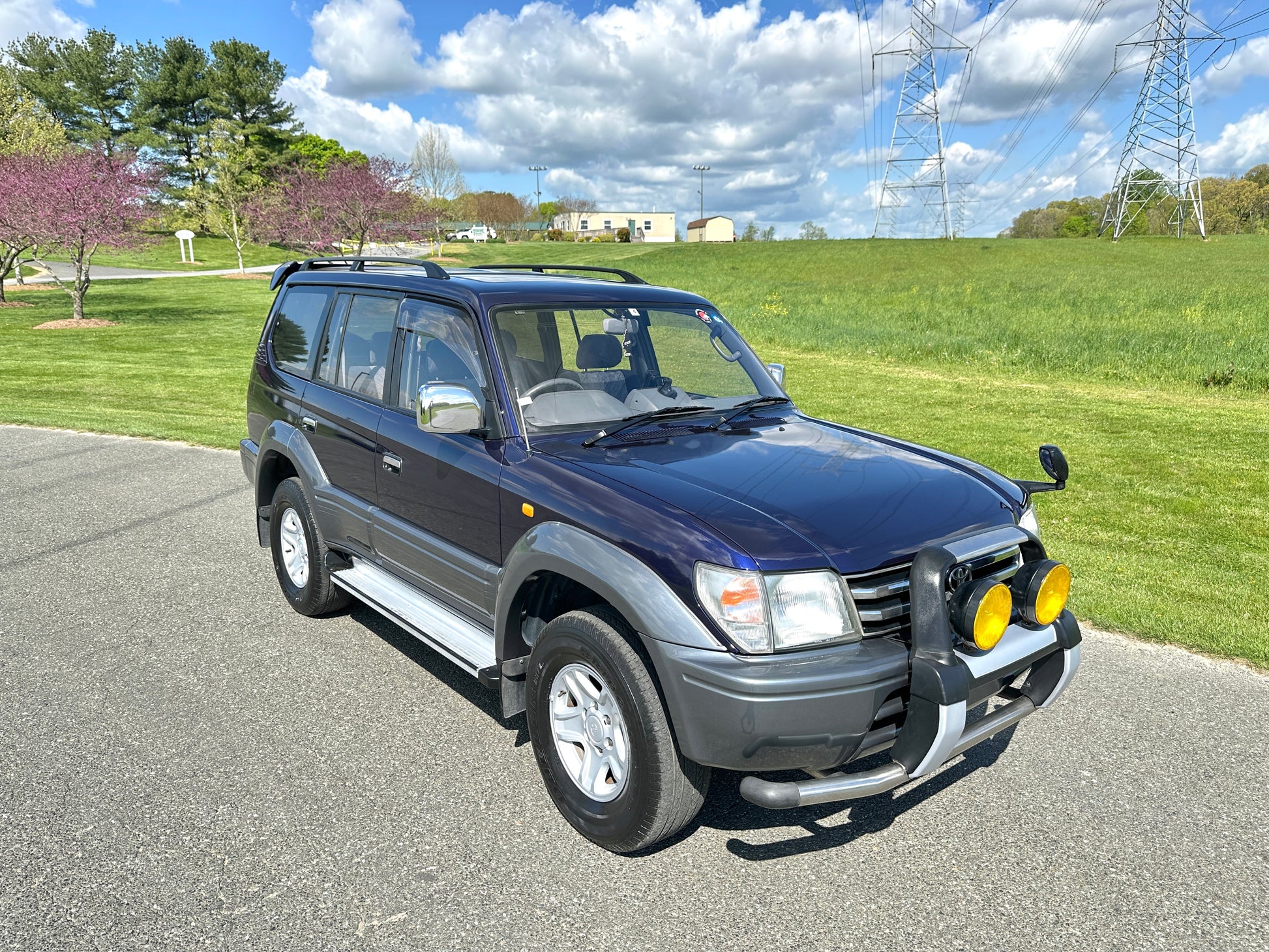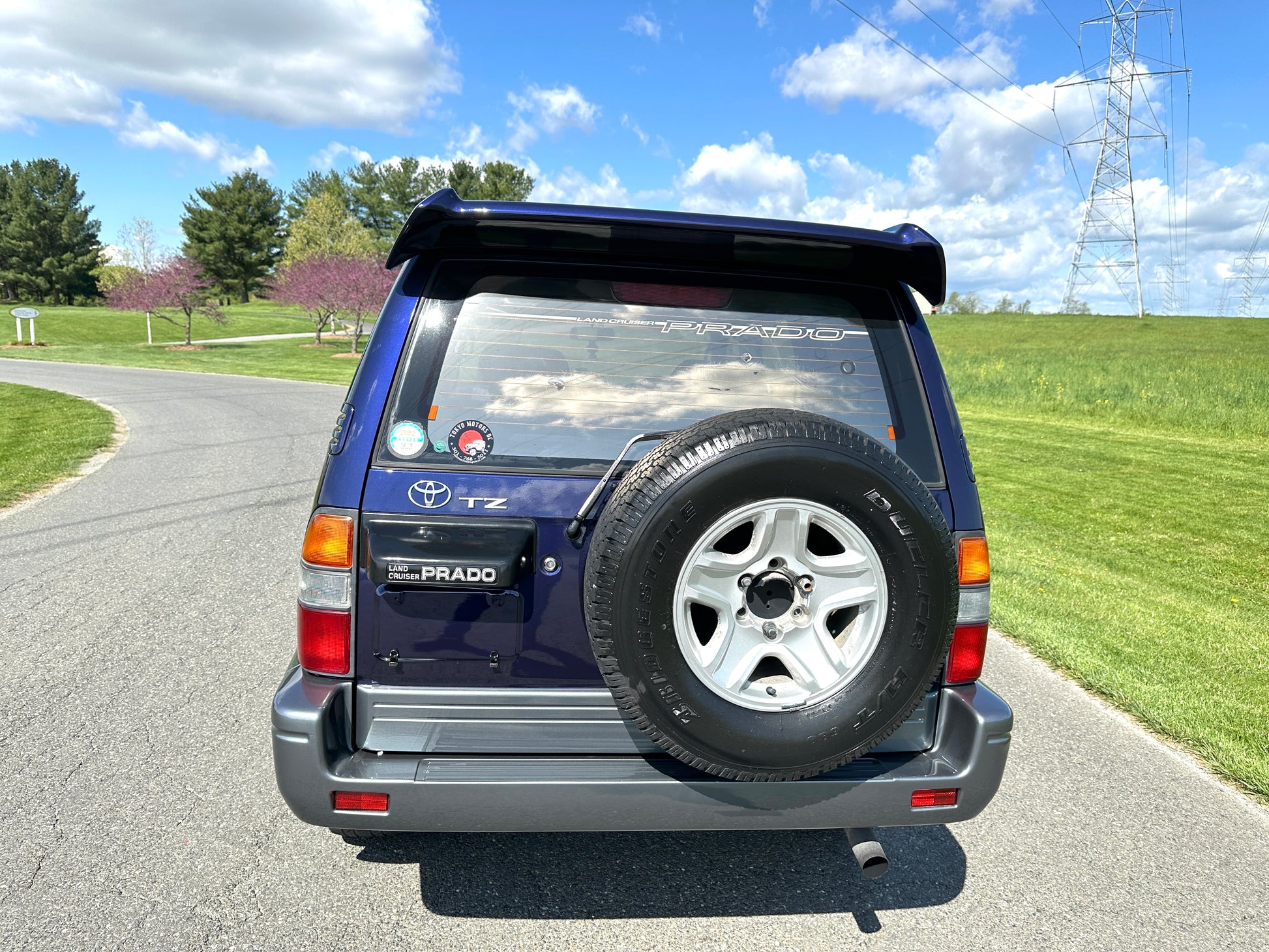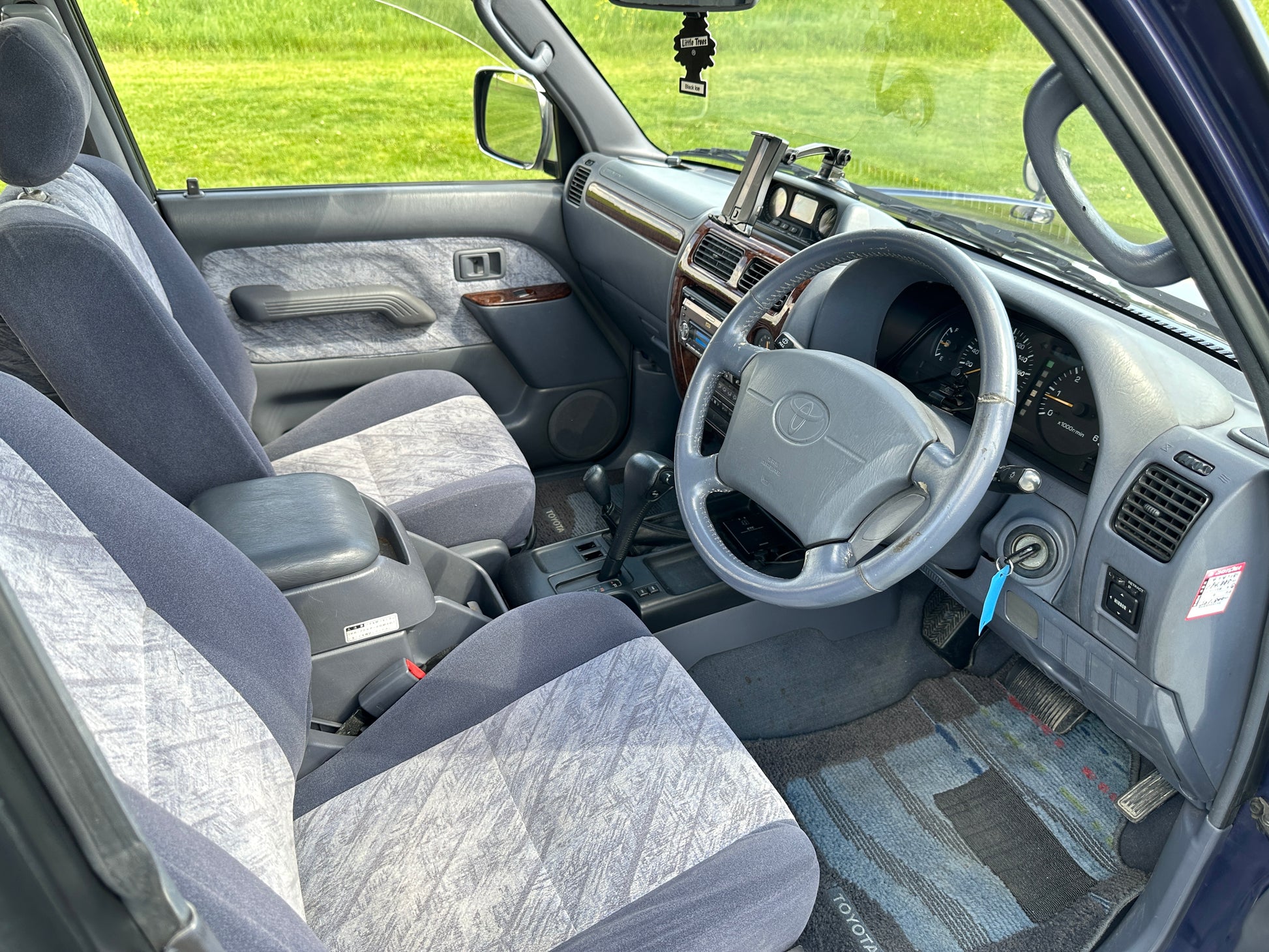 1997 Toyota Land Cruiser Prado TZ KZJ95——124,933 Miles, “1KZ-TE” 3.0 Liter Inline 4, Turbo Diesel, Automatic Transmission, Transfer Case With High And Low Ranges, Full-Time 4WD, Locking Center Differential, Stellar Blue Pearl / Gray Metallic Two-Tone (K14), Patterned Blue Cloth Upholstery With Wood Trim, SUNROOF, REAR OVERHEAD A/C VENTS, 3RD ROW SEATS, CENTER DIFF LOCK, Front Bull-Bar With Fog Lights, Rear Spoiler, OEM Rainguards, ABS, Dual SRS Airbags, Field Monitor System, Power Windows, Power Locks, Power Folding Mirrors, Automatic Dual-Zone Climate Control.