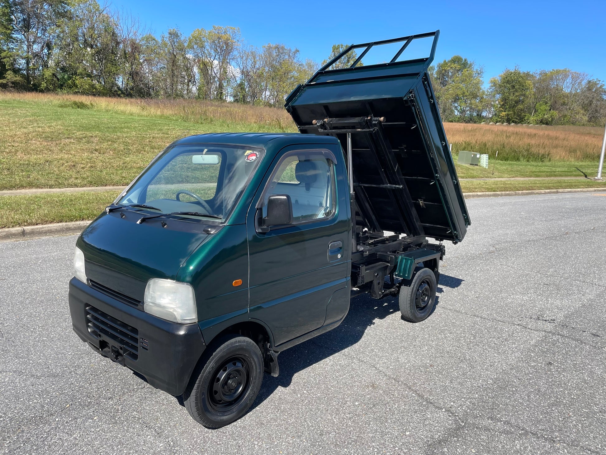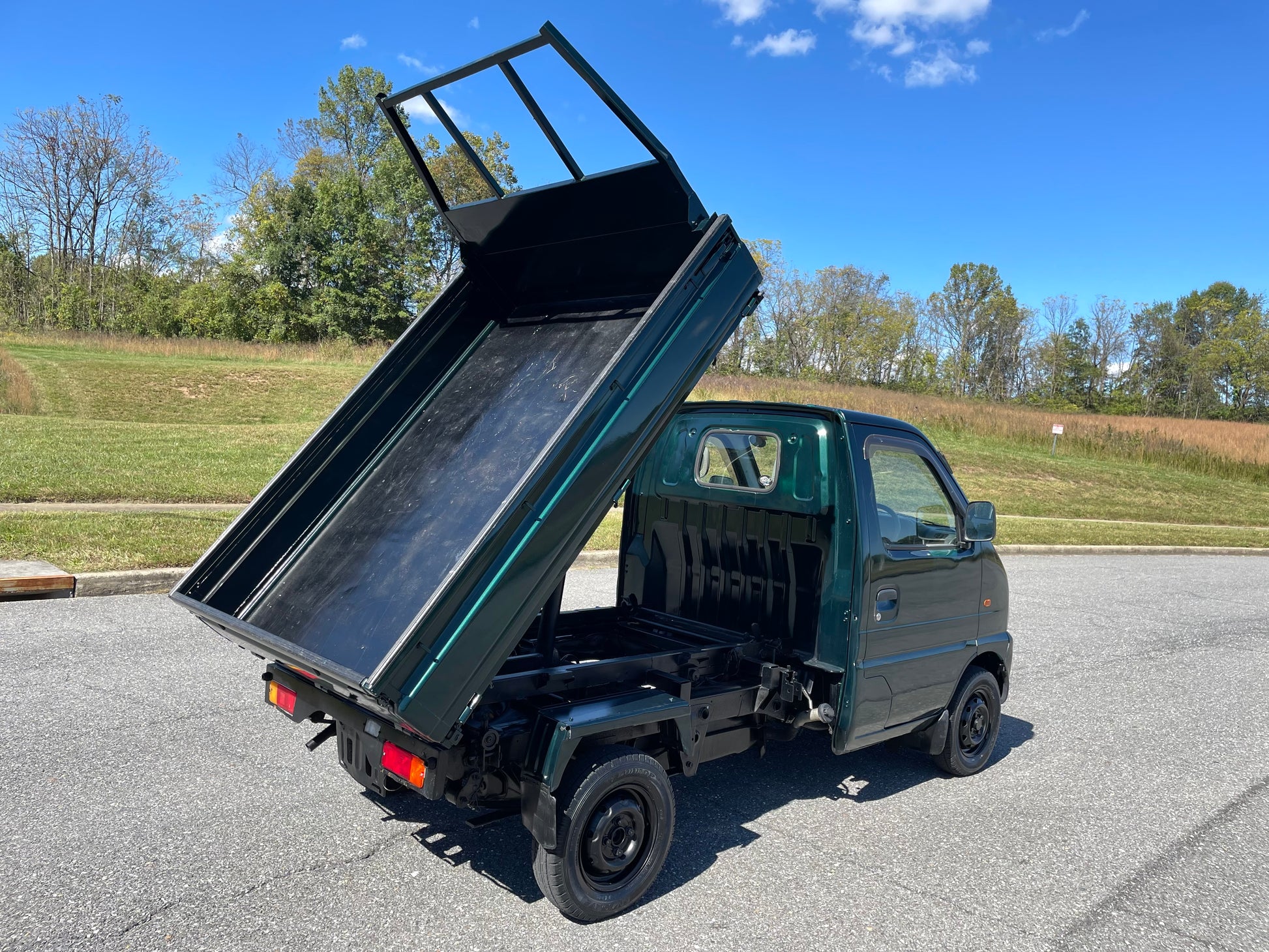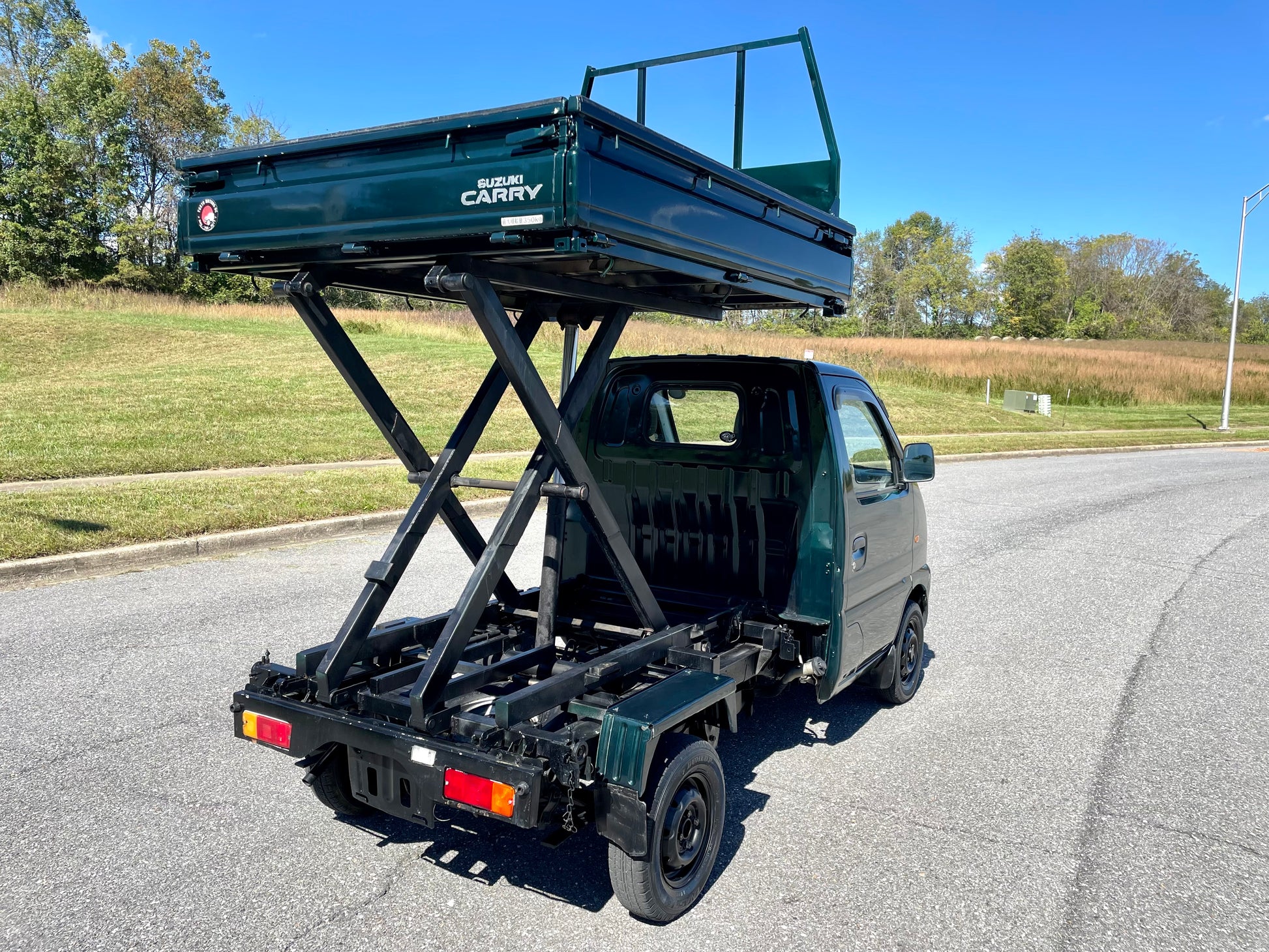 1999 SUZUKI CARRY GD-DB52T—— 46,760 Miles, “F6A” Engine, 660CC Inline-Three, ELECTRONIC FUEL INJECTED, Gasoline, 5-Speed Manual Transmission, Dual Range Transfer Case, Selectable 4WD, CUSTOM BRITISH RACING GREEN PAINT-JOB, DUMP BED WITH THE DROP-SIDES, SCISSOR LIFT With 350kg Load Capacity, Heat & Fan.